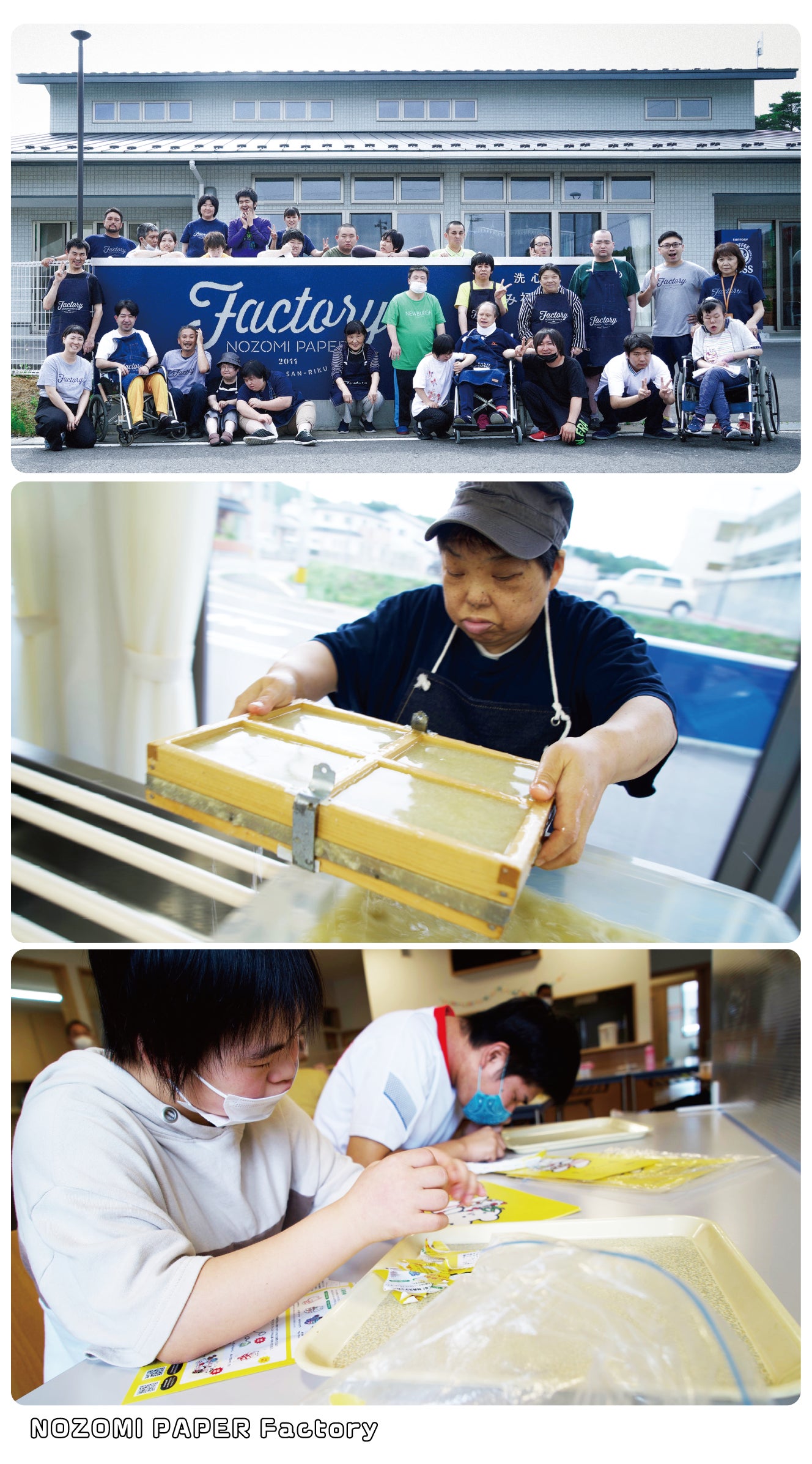 NOZOMI PAPER Factoryは、手漉きの再生紙「NOZOMI PAPER®︎」の生産とアート活動を行う福祉作業所と、デザインユニット「HUMORABO(ユーモラボ)」による、社会と福祉の楽しく新しい関係を探る協働プロジェクト。東日本大震災をきっかけに宮城県南三陸町「のぞみ福祉作業所」で誕生しました。今もつづく支援への感謝の気持ちを商品にかえて、人から人へ、想いを届けるお手伝いができることを楽しみに、 日々、笑顔の中で制作・創作しています。