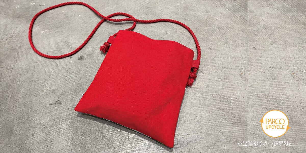表面は、懸垂幕の素材である防水の優れた「ターポリン」素材です。そしてサコッシュ裏面と内側には、赤色のキャンバス地を使用した丈夫な仕上がりです。さらに肩掛けの紐は、今回特別にきっこうちゃんの縄をイメージした仕様になっています。