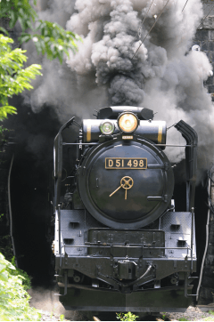 D51形蒸気機関車(デゴイチ)は、貨物用の「力持ち」の機関車として、1936(昭和11)~1950(昭和25)年にかけて1115両が製造されました。D51 498は、D51形の498番目の機関車として、1940(昭和15)年11月24日に旧鉄道省鷹取工場(兵庫県神戸市)で製造され、岡山・大阪・福島・新潟などで、1972(昭和47)年まで32年間活躍しました。引退後は、上越線の後閑駅前で「静態保存」されていましたが、1988(昭和63)年に「動態保存」の蒸気機関車として復活しました。