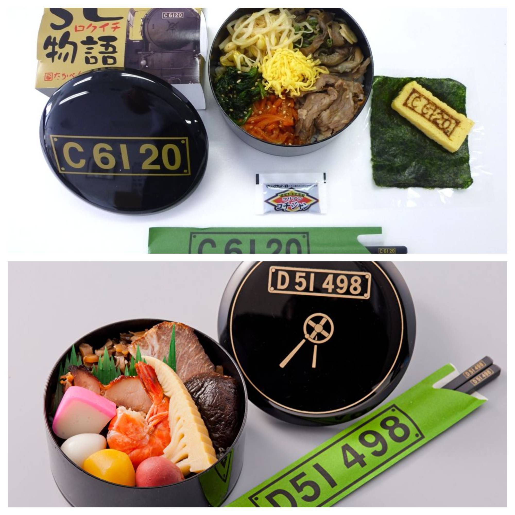 煙室扉に模したお弁当容器に竹炭入りの珍しい炭ごはんに機関車の雄々しさを表現したおかず入り。