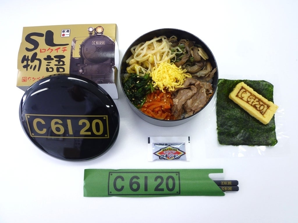 SLの雄々しさを食材で表現。型式の焼き印を施した玉子焼き入りのビビンバ風弁当。