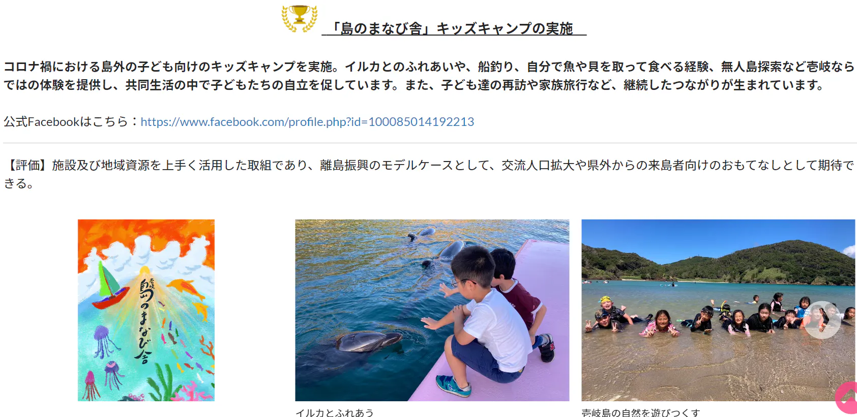 「コロナ禍における島外の子ども向けのキッズキャンプを実施。イルカとのふれあいや、船釣り、自分で魚や貝を取って食べる経験、無人島探索など壱岐ならではの体験を提供し、共同生活の中で子どもたちの自立を促しています。また、子ども達の再訪や家族旅行など、継続したつながりが生まれています。」