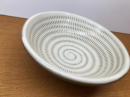 飛び鉋(とびかんな)とは、工具の刃先を使って連続の切り目をつける技法のことで、小石原焼によくみられる模様になります。ろくろを回しながら粘土に刃先を当てることで陶器の表面に模様ができる職人技です。この連続した模様こそが、シンプルでありながら可愛らしさと気品を兼ね備えた原彦窯元の特徴になります。