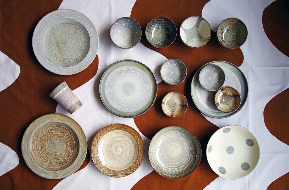 原彦窯元は、伝統を受け継ぎながら私たちの生活に小石原焼を身近に感じさせてくれる窯元です。デザインは、現代の生活に取り入れやすいものが多く、食器だけでなくインテリアも充実しています。作家の梶原正且、梶原大祐を中心に制作しており、真っ白な化粧土にとても細やかな鉋が刻まれた飛び鉋の皿が特徴です。