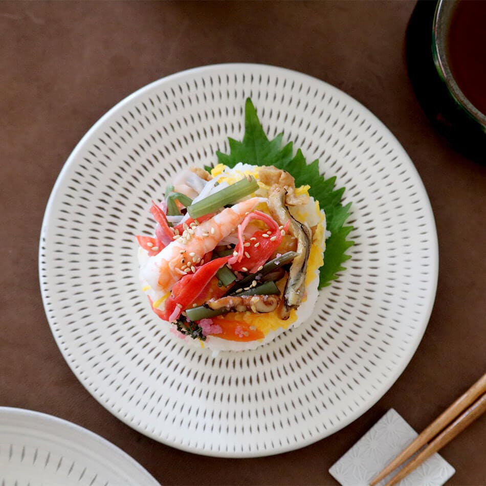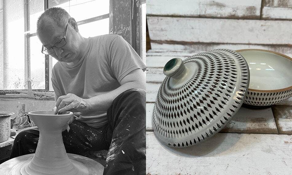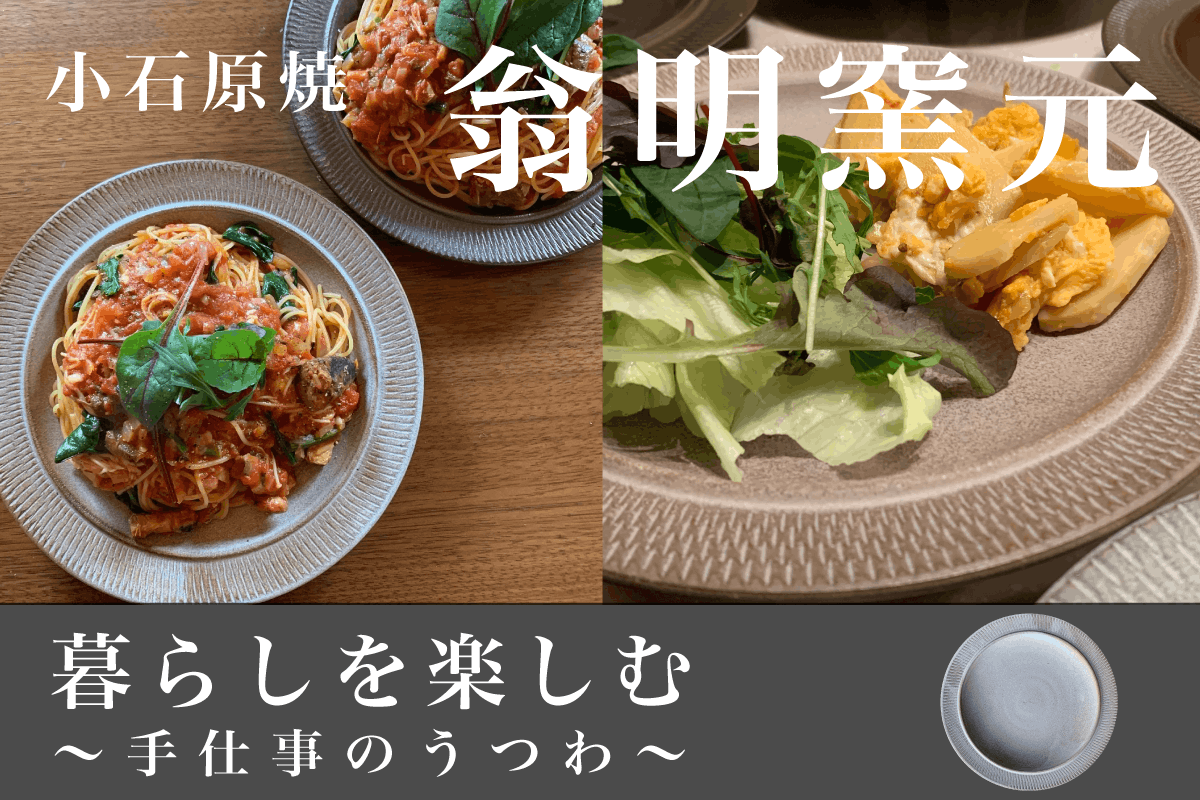 作り手である鬼丸翁明が大切にしていることは、伝統を受け継ぎ伝えるとともに、現代に合わせた作品を新しく生み出すことです。その意志を貫くように、作品にはマット感やいまどき感が表れており、料理をひき立てる役目として作品をつくっている点も翁明窯元ならではの思想になります。また、小石原の土は鉄分が多く、焼くと黒っぽい印象になるため、そこに白い化粧土を入れることで白黒の対比が楽しめます。どのような模様になるかは、作家の個性が表れる点でもあるため、好みのものを探していく楽しさも醍醐味のひとつです。