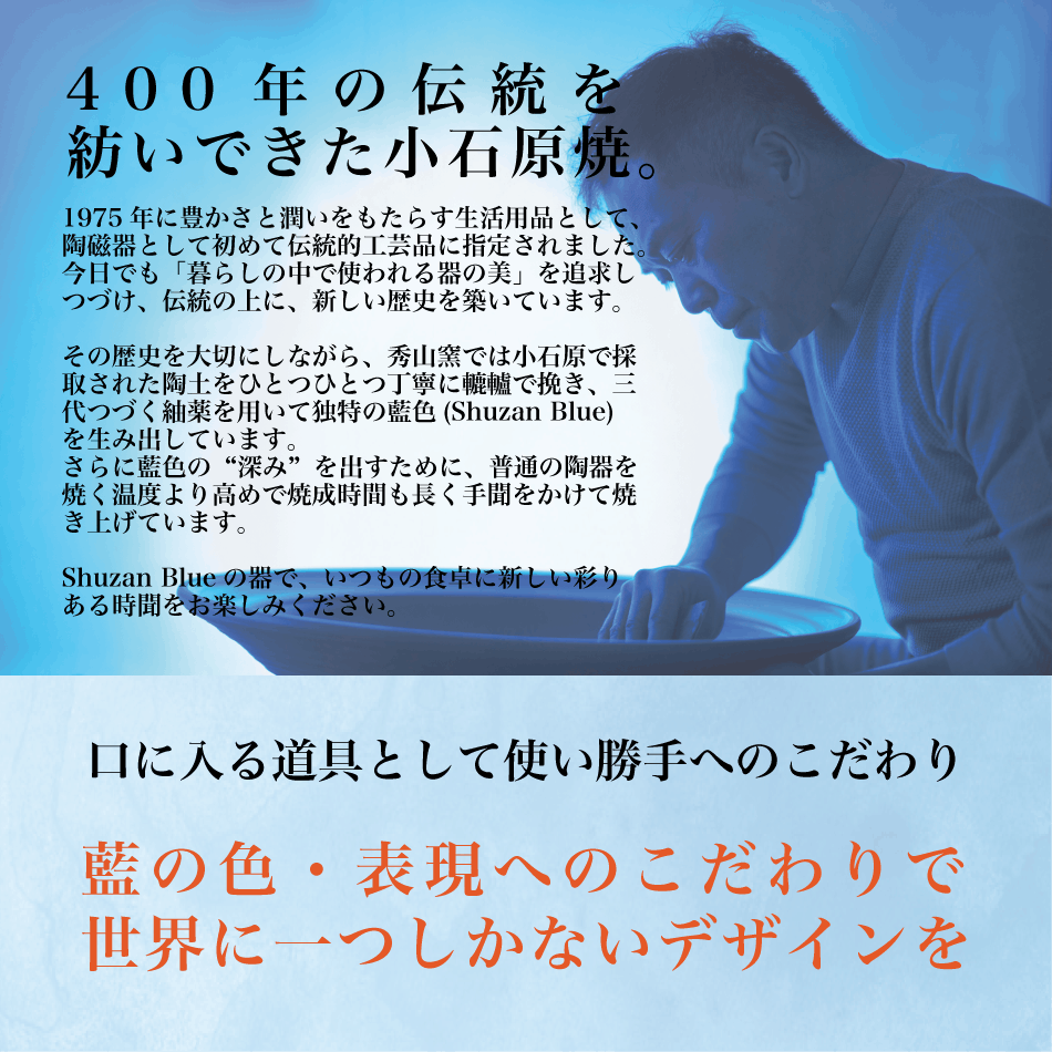 秀山窯は、三代つづく紬薬を用いて他にはない独自の藍色を生み出す窯元です。初代里見秀治が秀山窯を開き、その後二代目である里見重信が引き継ぎ秀治と共に新しい藍釉を開発し独自の世界観を確立します。現在は三代目の里見武士と重信が、秀山窯でしかつくることのできない小石原焼をつくり表現しています。