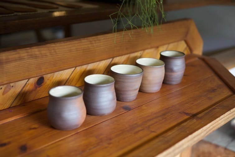 明るめの色味は、登り窯と言って窯が連なって階段状に並んでいるのが特徴です。一方で、渋い色味は窖窯(あながま)と言ってより深い色味に仕上げたいときや一点もののうつわを焼き上げることに向いています。作品は、マグカップやうつわなどの食卓で使えるものから、花瓶や表札などのオブジェ類と幅広く制作しているので、お好みのものを見つける過程もお楽しみください。