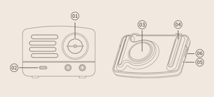 ①電源スイッチ/ボリュームノブ/Bluetoothリセット