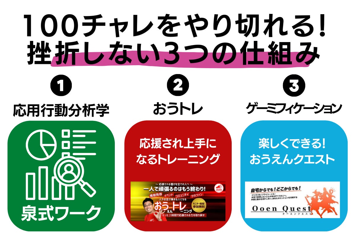 応用行動分析学をベースにした3つの独自メソッドと、挑戦を応援し合うコミュニティ活動によって、100日間みんなで一緒に挑戦していきます。