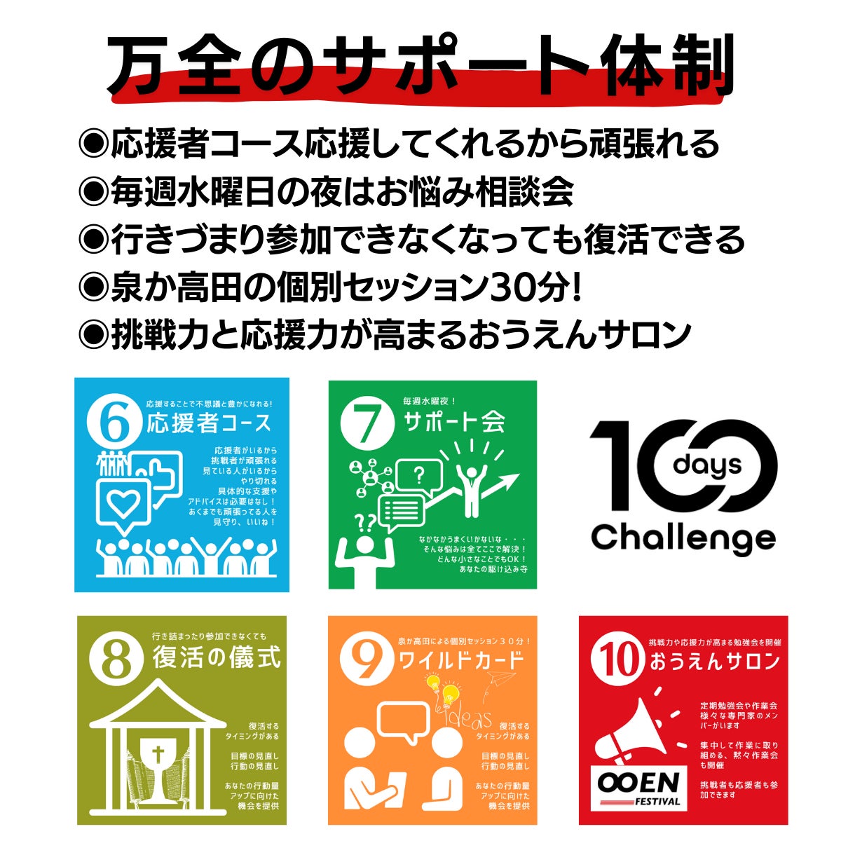 泉、高田どちらかによる個別セッション30分!スタート時や挫折した時、ブーストしたい時など、100日間の好きなタイミングでご活用ください!