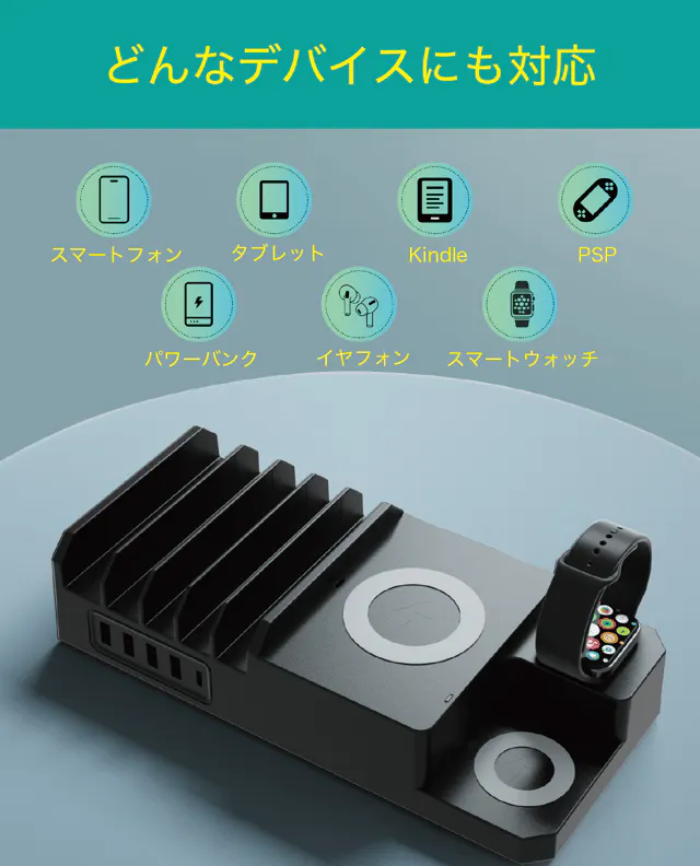 【 TERMINALIA 】はUSB Type-A、USB Type-C、ワイヤレスの3種のポートを装備していますので、スマートフォン、タブレットはもちろん、パワーバンクやスマートウォッチ、イヤフォンなどあらゆるデバイスにも充電できます。