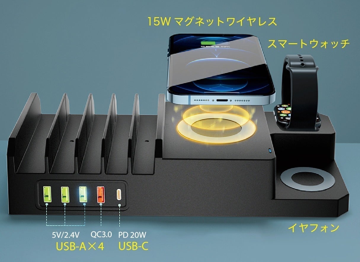 【 TERMINALIA 】はスマートフォンやタブレットからイヤフォン 、スマートウォッチまであらゆるデバイスを8台同時に接続できる、オールインワン充電ステーションです。