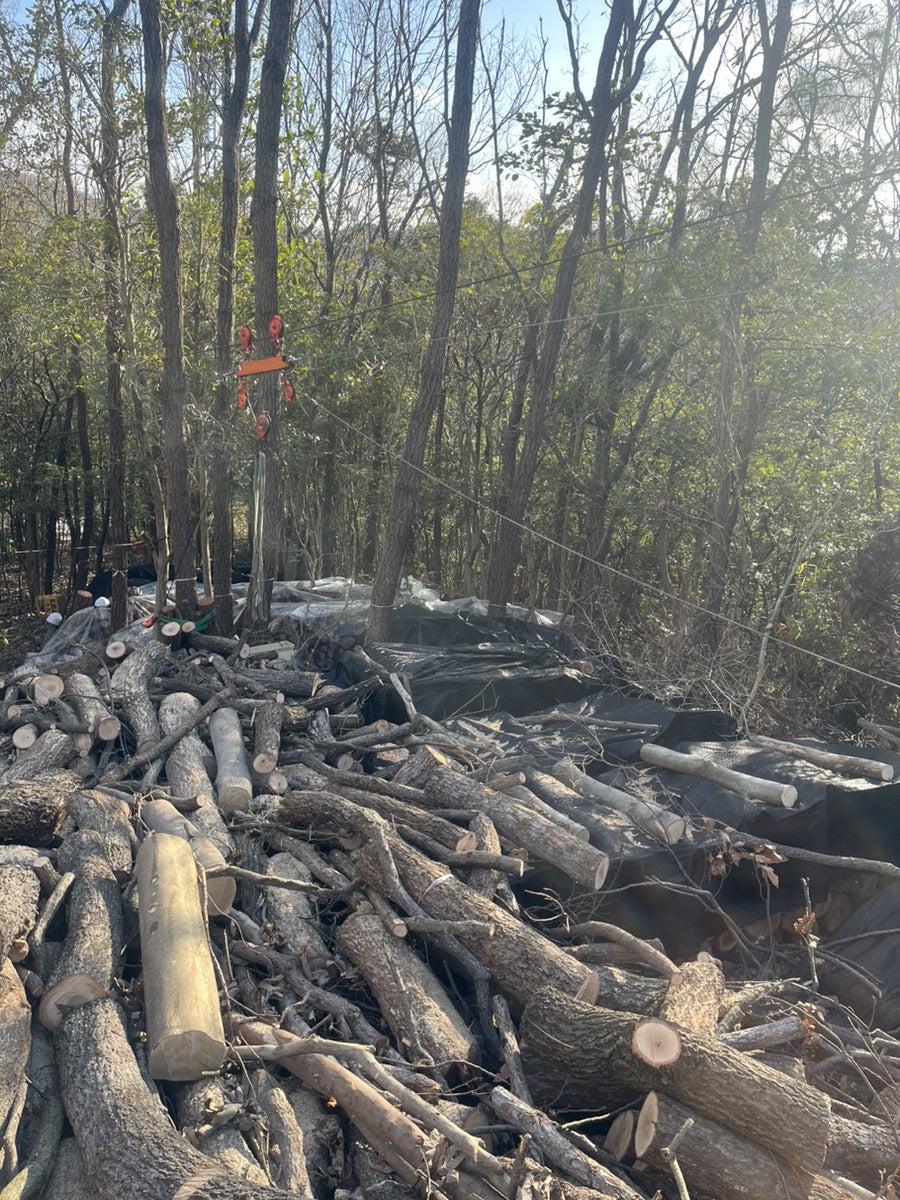 久々のご報告となりましたが、現時点の範囲内(搬器が届く距離) の集材は順調に進み、玉切りまで完了しております!玉切りされた原木山の上にはまだまだ木があるのでメインワイヤーの設置場所を変更し、残りの集材に取り掛かっています!(^^)!前回よりも左に索張り集材の様子メインワイヤーの位置を変更したことにより、リフティングワイヤーも張り直し、エンドレスワイヤーの位置も変更したので中々大変でしたが(私はヘトヘトになりました笑)、その甲斐あってグイグイ引っ張ってくれるので一安心です(^^♪太い木もしっかり引っ張れますもうしばらくは集材が続きますが、その後は玉切り→植菌となりますので、今後も頑張って参ります!