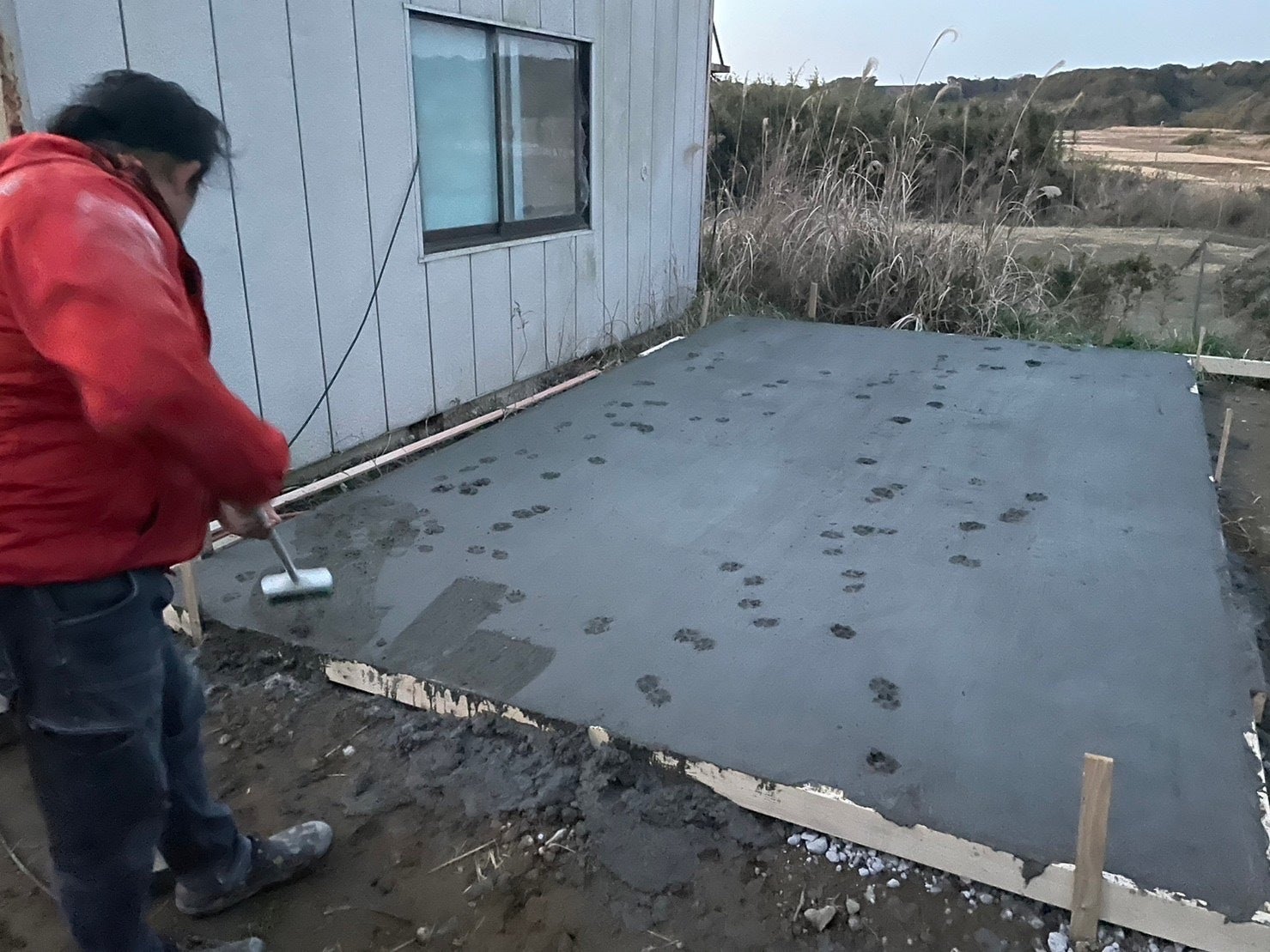 大型冷蔵庫設置に向けてのコンクリを流し終わり、乾燥を待っていて目を離した隙に謎の足跡が...