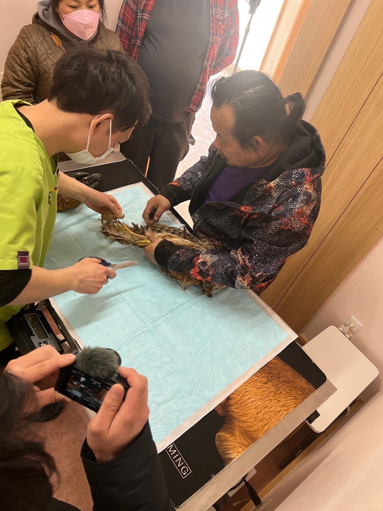正午頃、一般の方から一本の電話があり、飼っているニワトリを狙って鶏小屋にサシバが突っ込んできて怪我をしているかもしれない、という相談でした。野生傷病鳥獣に関する相談は頻繁にあり、怪我をしている可能性があるため、相談者の方にはすぐに受け入れることを伝え、ほどなくして1羽のタカが運び込まれました。日本ペット診療所の山川院長と、パンク町田先生の立会いの下、一通りの診察を行い、幸い大きな怪我はしていませんでしたが、左翼の動きが悪いことが判明しました。サシバということで運び込まれた鳥はメスのオオタカでした。通常、野生のオオタカは鳩などの鳥類や、小型の哺乳類などを捕食していますが、家禽を狙って人家に飛び込んでくる野生の猛禽類の多くは、怪我などが理由で満足に狩りができず、食べ物にありつけないことから、簡単に捕らえることができる家禽を狙ってこういった行動を取ることがほとんどです。本日運び込まれたオオタカは、このまま放鳥をした場合に再び家禽やペットを襲う可能性があるため、しばらくは当施設にて管理、観察、必要に応じてリハビリをし、問題がないことが確認できた後に放鳥をするという運びになりました。