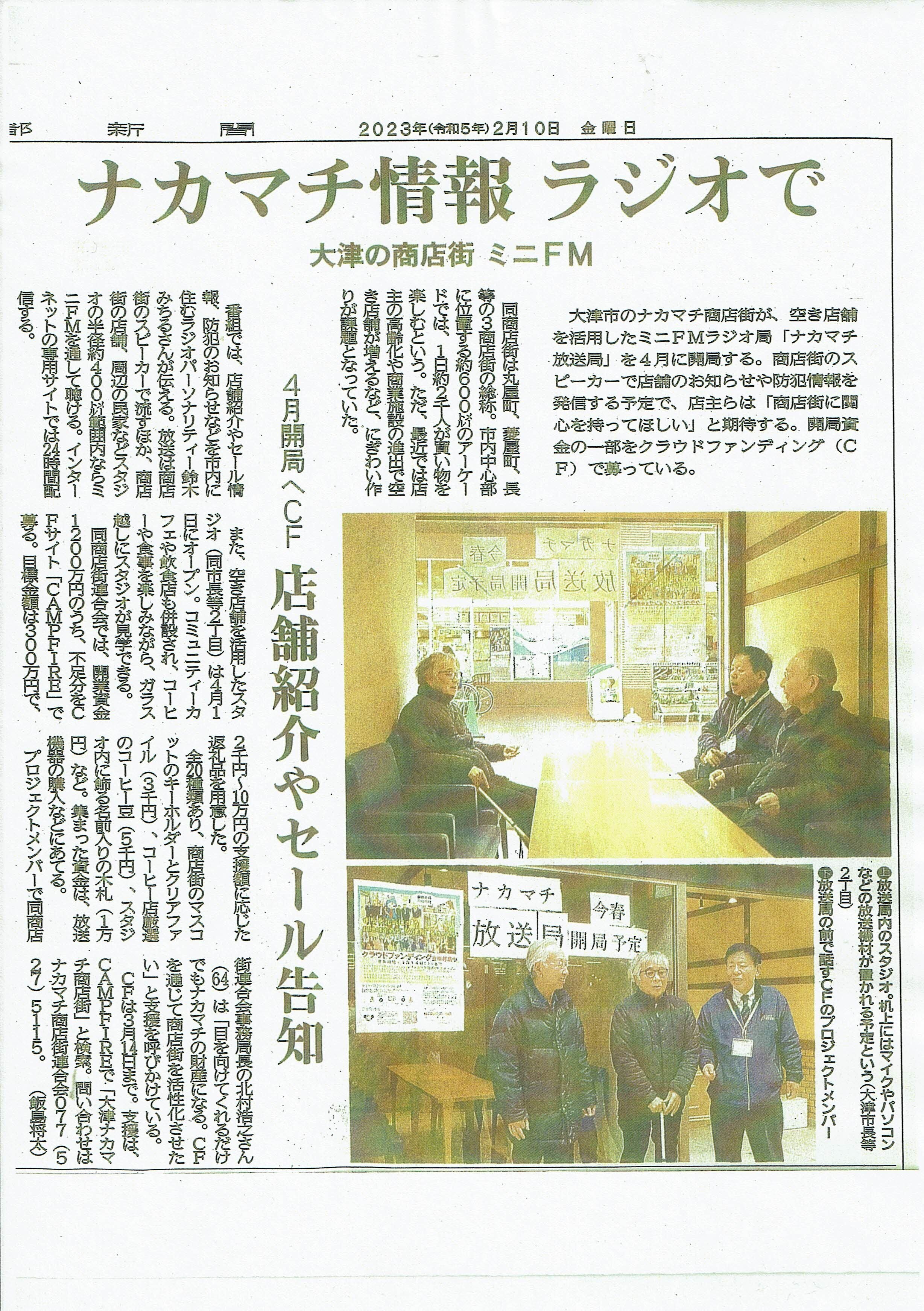 大津ナカマチ商店街・ナカマチ放送局の記事が今日(2月10日)の京都新聞の朝刊(滋賀県版)に掲載されました。 「目を向けてくれるだけでもナカマチの財産になる。CFを通じて商店街を活性化させたい」とは当該クラウドファンディングプロジェクトメンバーでもあるナカマチ商店街連合会事務局長のコメント。