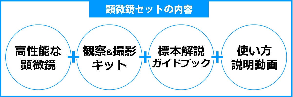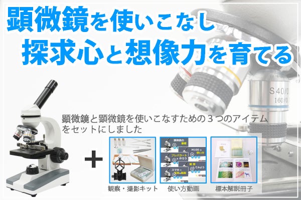 この顕微鏡セットは「子供の探求心と想像力を育てる」ことを目的としています。そのため、高性能な顕微鏡と、顕微鏡を使いこなすためのアイテムをセットにしたものです。