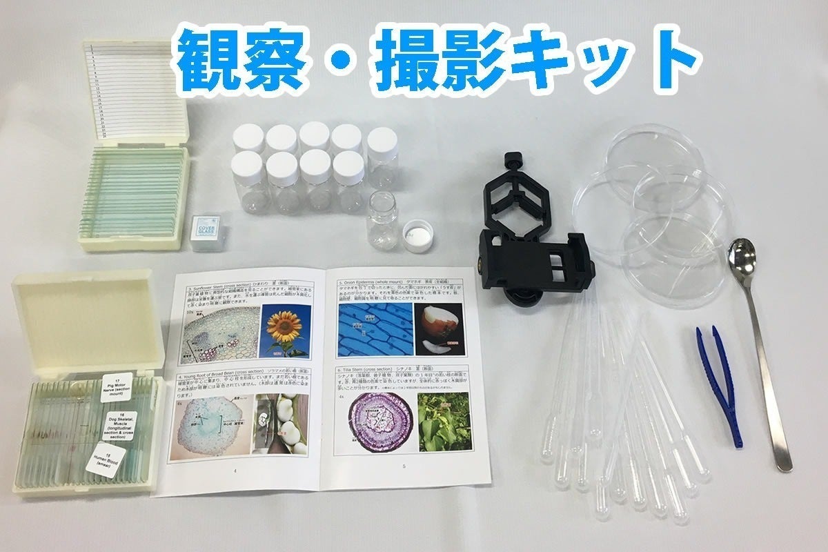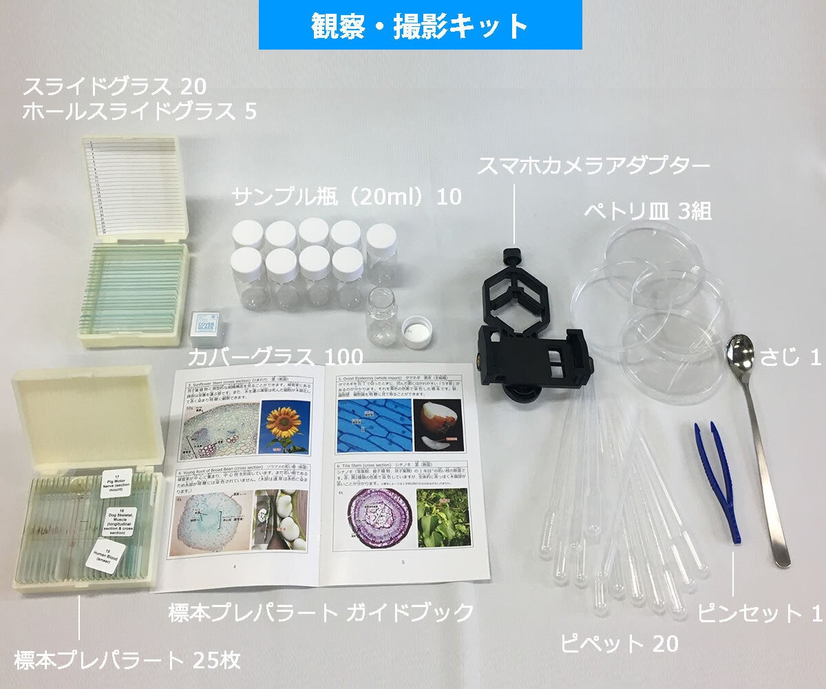 観察・撮影キットには、顕微鏡観察に必須の、スライドグラス、カバーグラスの他、観察対象物の採取に便利な、サンプル瓶、ペトリ皿、さじ、ピンセット、ピペットの他、25種類の標本(ガイドブック付)、及び、スマホで顕微鏡撮影するためのスマホカメラアダプターが付属しています。