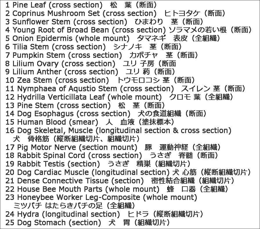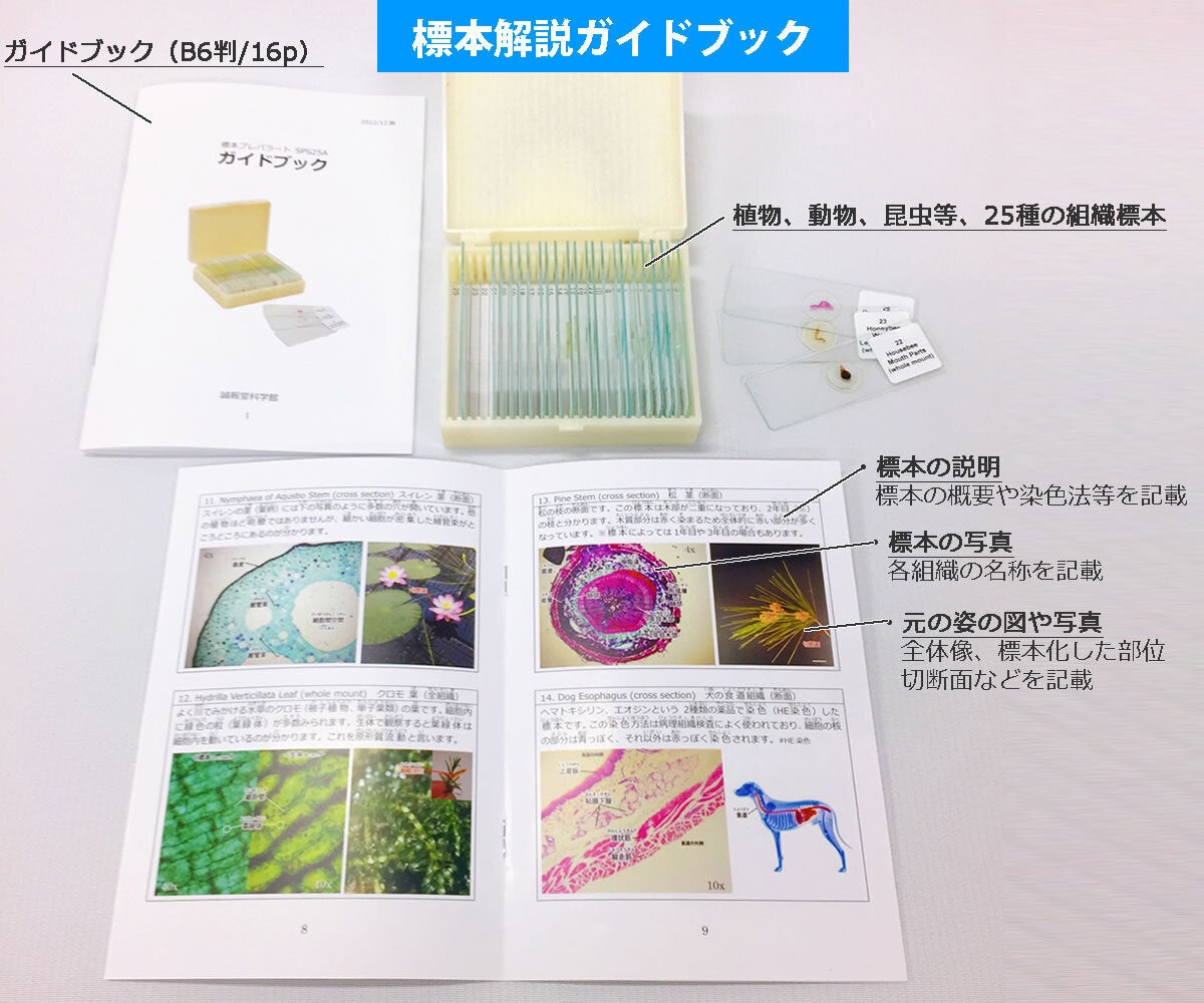 ただ単に標本を顕微鏡で見るだけでは何も得られません。そこで、当店自らガイドブックを作成いたしました。これには、各標本の実際の写真、その標本は元々どんな植物(動物)のどの部分なのかの説明、各組織の名称、染色方法などを記載しています。これら記載内容をキーワードとしてインターネットを活用するなどしてご自身で検索・学習することにより、より深く理解することが出来、各標本を楽しく観察することができるでしょう。