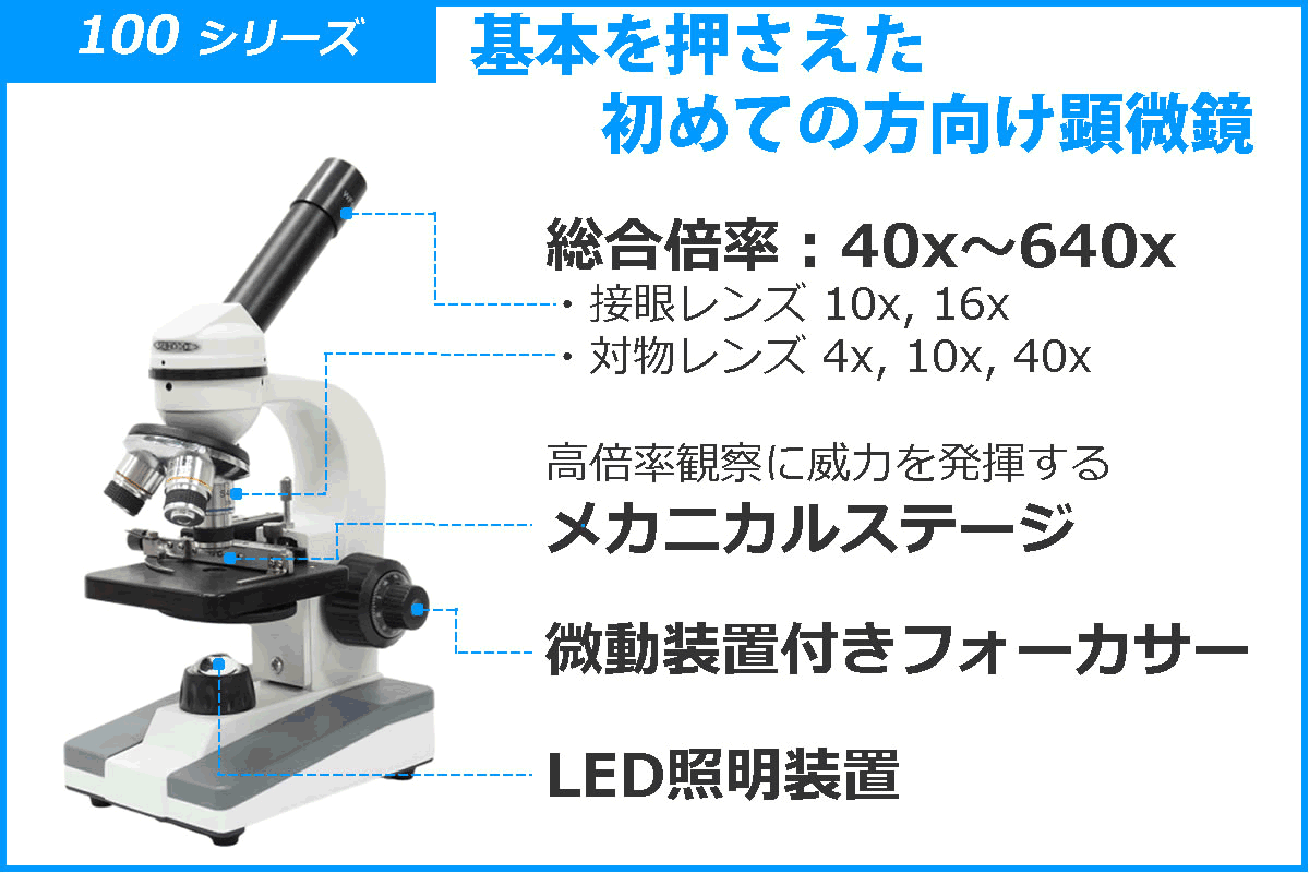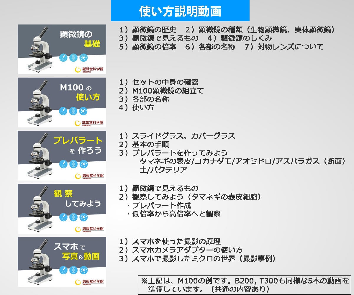 ・顕微鏡(本体)、観察用アイテムだけでなく、当店オリジナルの標本の解説ガイドブック、及び、構造、名称、使い方等の動画をセットにし、「使いこなせる顕微鏡」を目指しています。