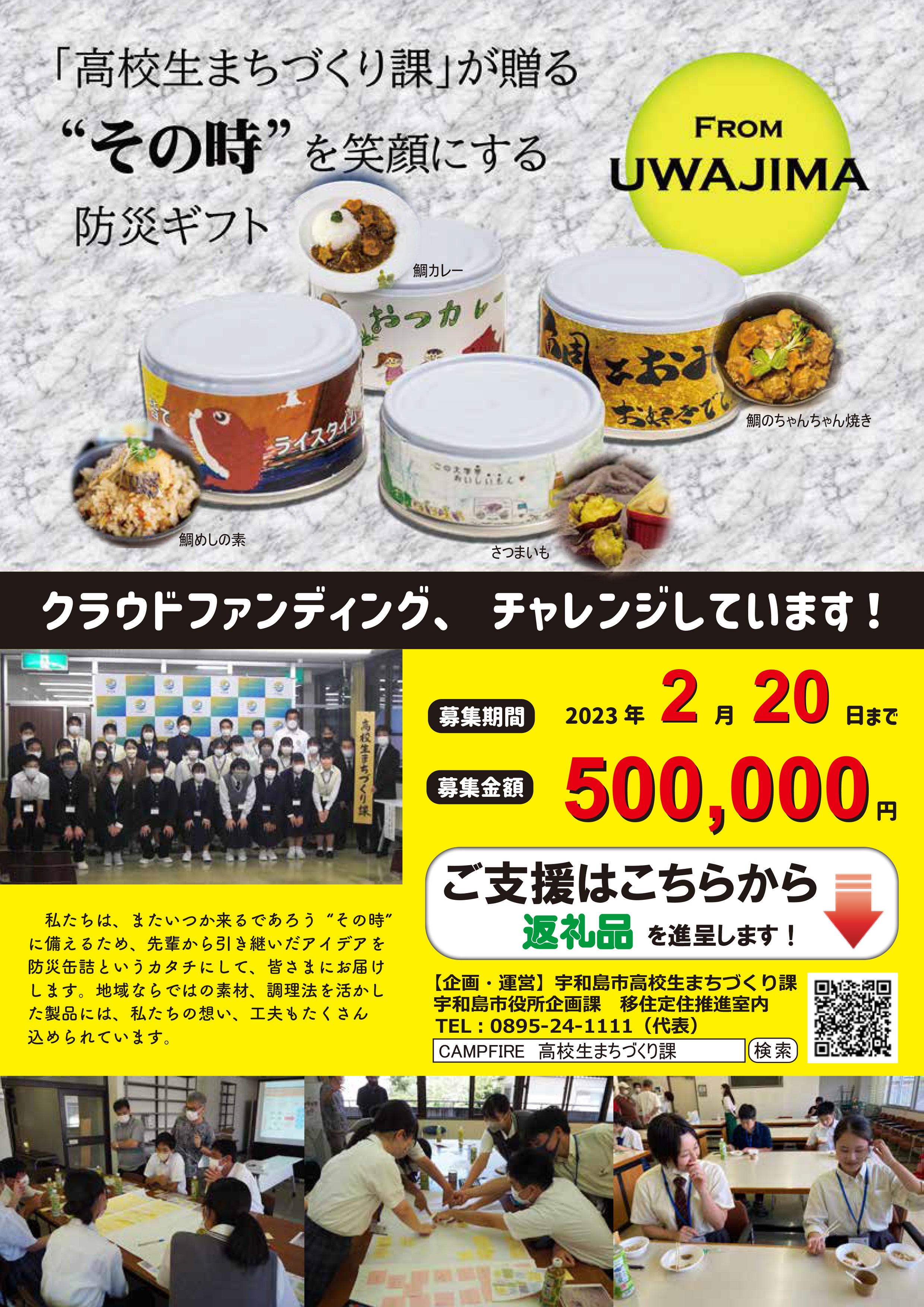 こんにちは!宇和島市 高校生まちづくり課 です♪私たちが行っている「おかえりプロジェクト」の集大成として、4つの「防災缶詰」を完成させました!それを広く皆さまにお届けするため、クラウドファンディングを始めました。始めてすぐ、3名の方にご支援をいただきました!ありがとうございます!皆さまの熱いご支援をお待ちいたしております。よろしくお願いいたします!!
