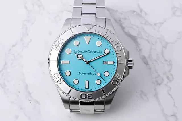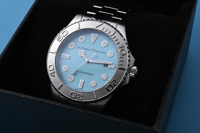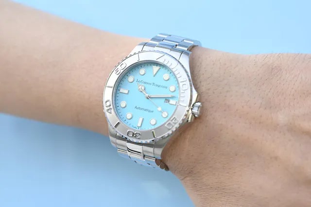 ダイヤルの美しいアイスブルーに加え、高級時計と同じ発光インデックスを採用しました。