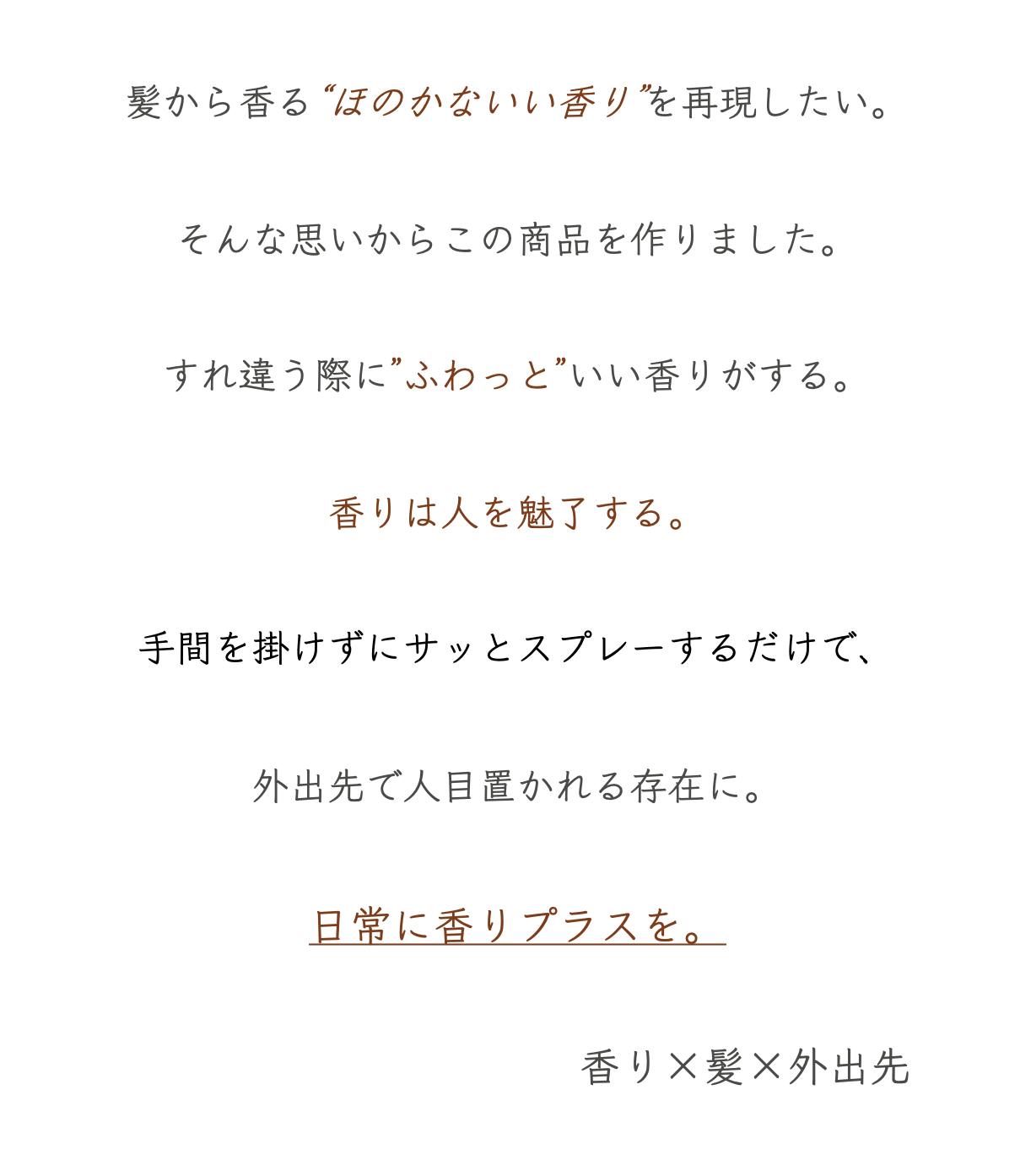 ・表面だけでなく髪の内側にかけると、”ふわっと”した香りをつけやすくなります。