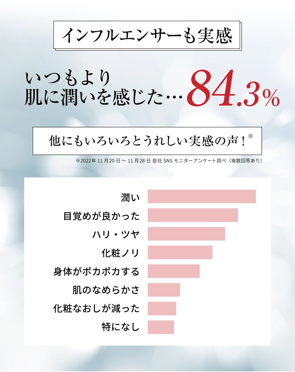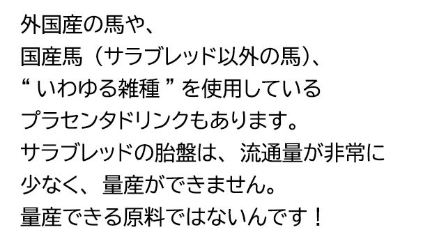 ・原材料:馬プラセンタエキス(国内製造)、フィッシュコラーゲンペプチド、エリスリトール、加水分解エラスチン、セラミド含有コーン抽出物/酸味料、香料、甘味料(スクラロース、ステビア、アセスルファムK)、保存料(安息香酸Na)、ヒアルロン酸、ビタミンB2、ビタミンB1、ビタミンB6、葉酸(一部にゼラチン、大豆を含む)