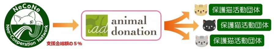 :合同会社NeCoNe(以下「ネコネ」という)と公益社団法⼈アニマル・ドネーション(以下「アニドネ」という)は本プロジェクトを実施し、支援金総額(手数料控除前)の5%をネコネからアニドネに寄付することについて合意しています。