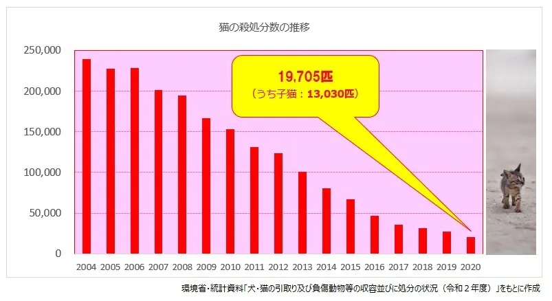 今日、保護猫活動が全国に拡大し、猫の殺処分数は年々減少していますが、現在もなお年間約2万匹の猫が殺処分されており、このうち13,030匹(66%)が離乳していない子猫です(令和2年度・環境省自然環境局の統計資料 )。