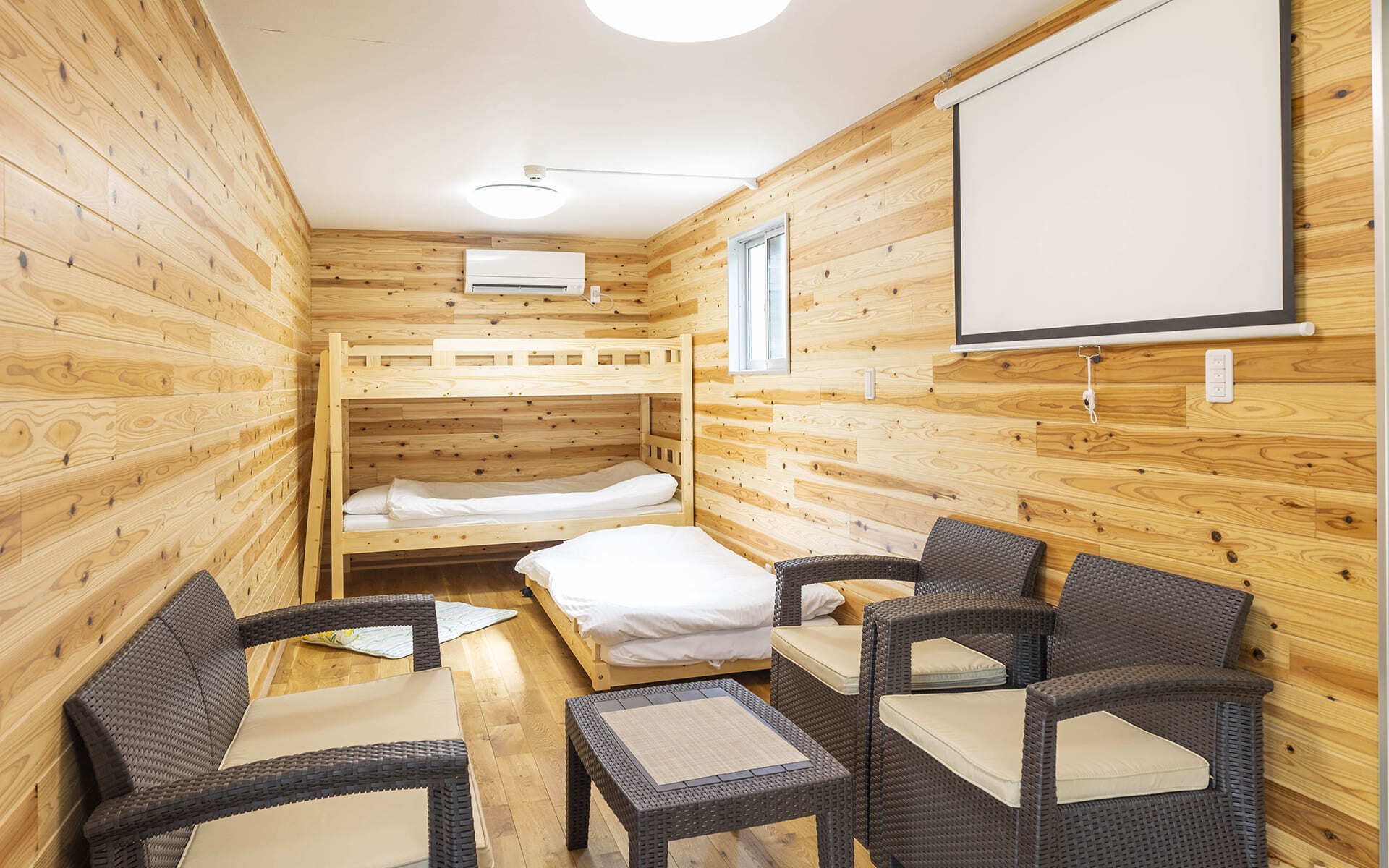 食事兼寝室スペースは床も壁もひのき張り。ラグジュアリー感漂うリラックス空間となっています。