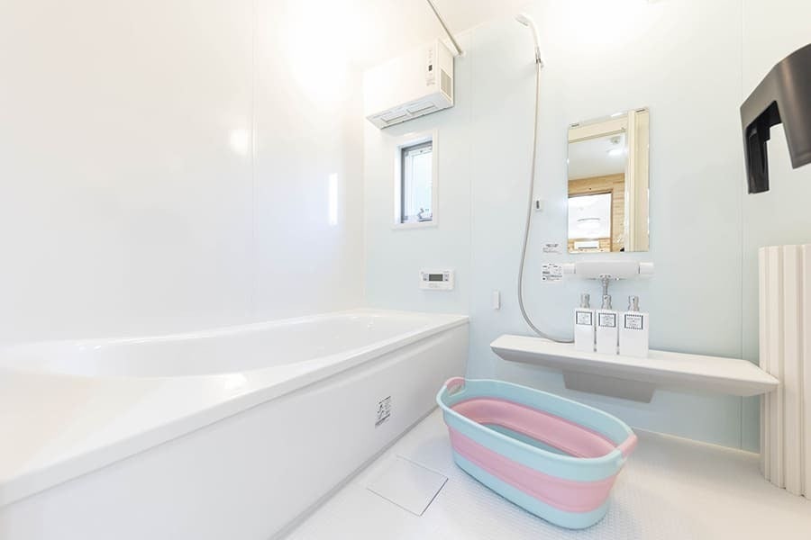 また、キッチンはもちろん、広々としたバスルームも完備。シャワールームしかないアウトドア施設が多いなかで、「脚を伸ばしてのんびりお風呂につかれる時間」を満喫していただきたいと、こだわって設計、製作しました。