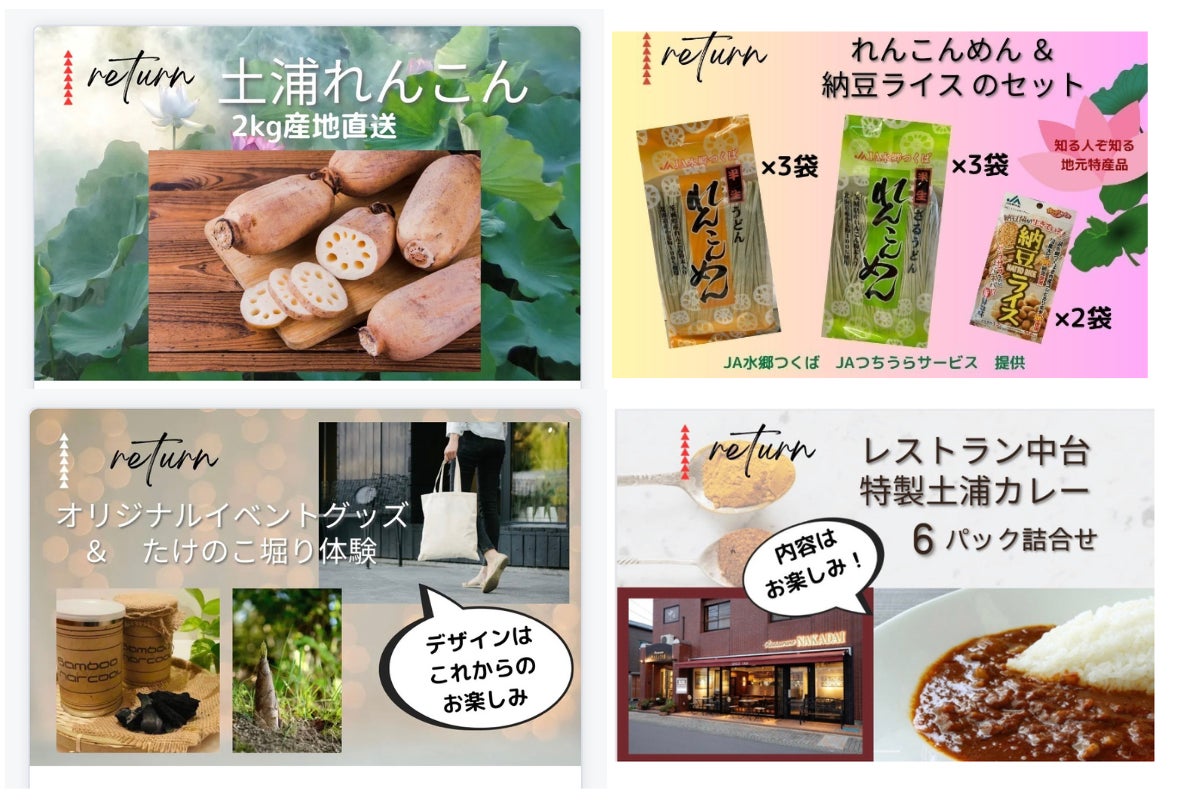 クラウドファンディングを通してこのイベントにお申込みいただくことで、イベント自体が賑やかに盛り上がっていきます。当日ご参加が叶わなくても、下の画像のように、茨城・土浦を感じていただけるリターンをご用意しました。