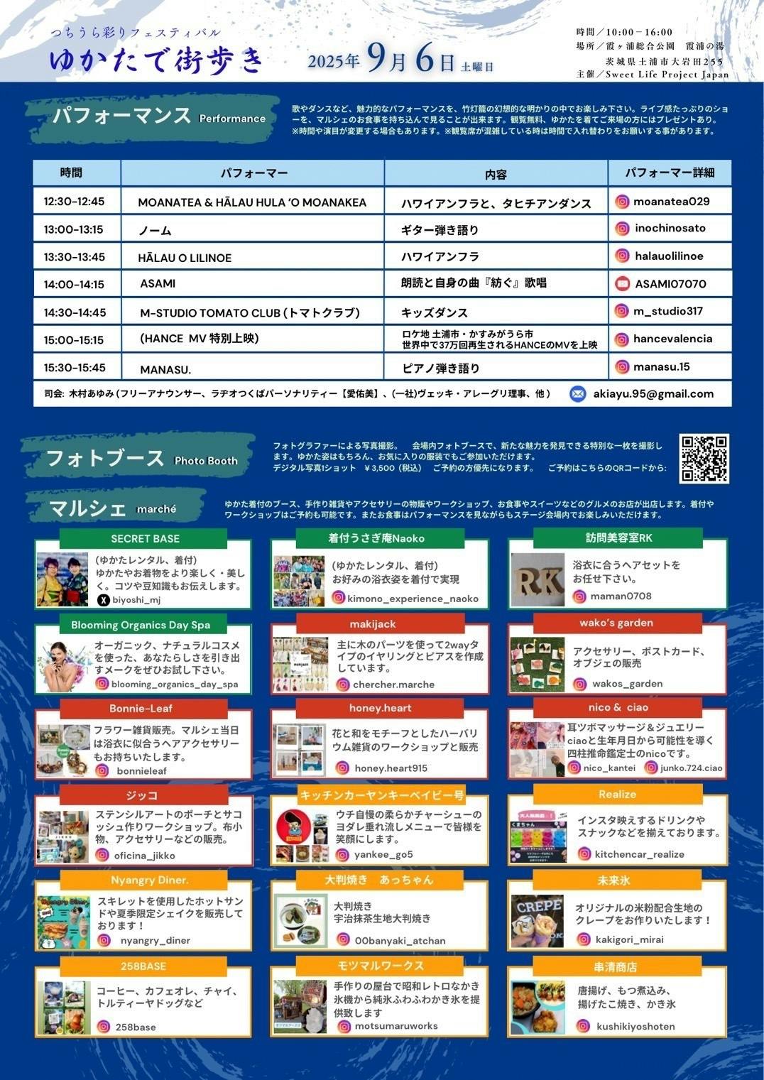 ゆかたを着て街歩きや撮影を楽しんだり、竹灯籠のあかりやマルシェ、ステージパフォーマンスなど、夏の終わりを彩る一日をご用意しています。