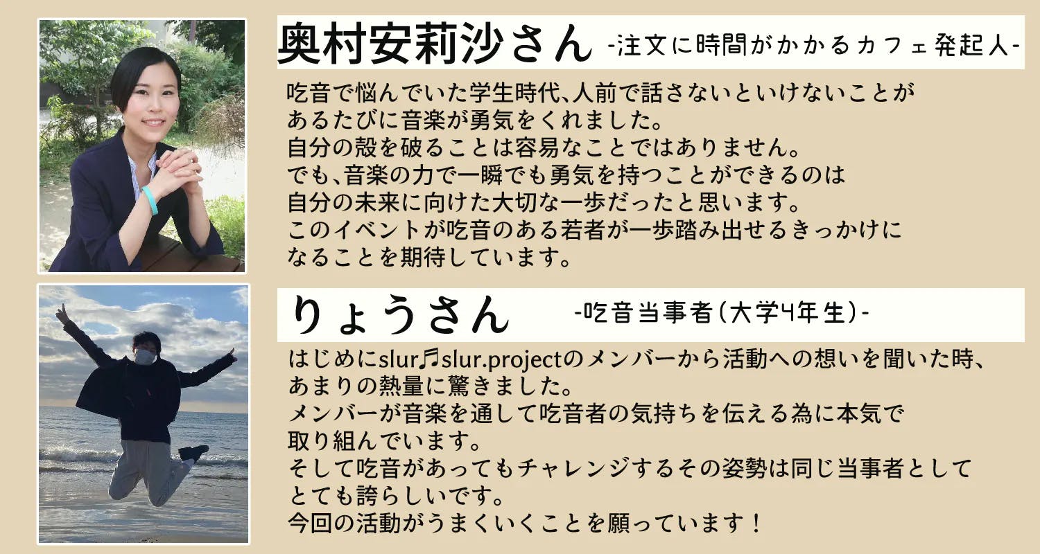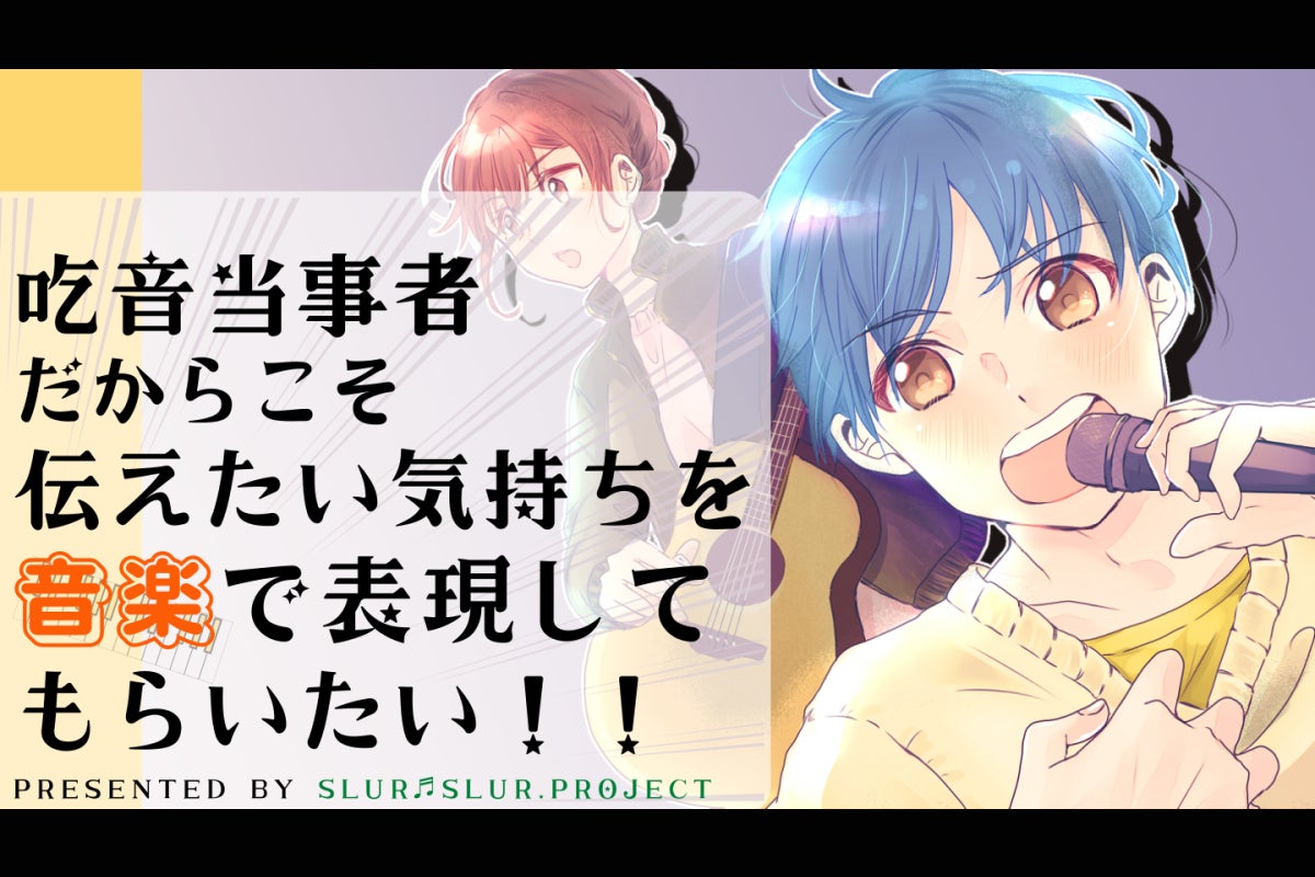 【slur♬slur.project】(スラースラープロジェクト)とは吃音当事者が抱える気持ちや伝えられない想いを“音楽”を通して表現し、吃音当事者を中心により多くの方々に対し発信・活動していくために立ち上げたプロジェクトです。