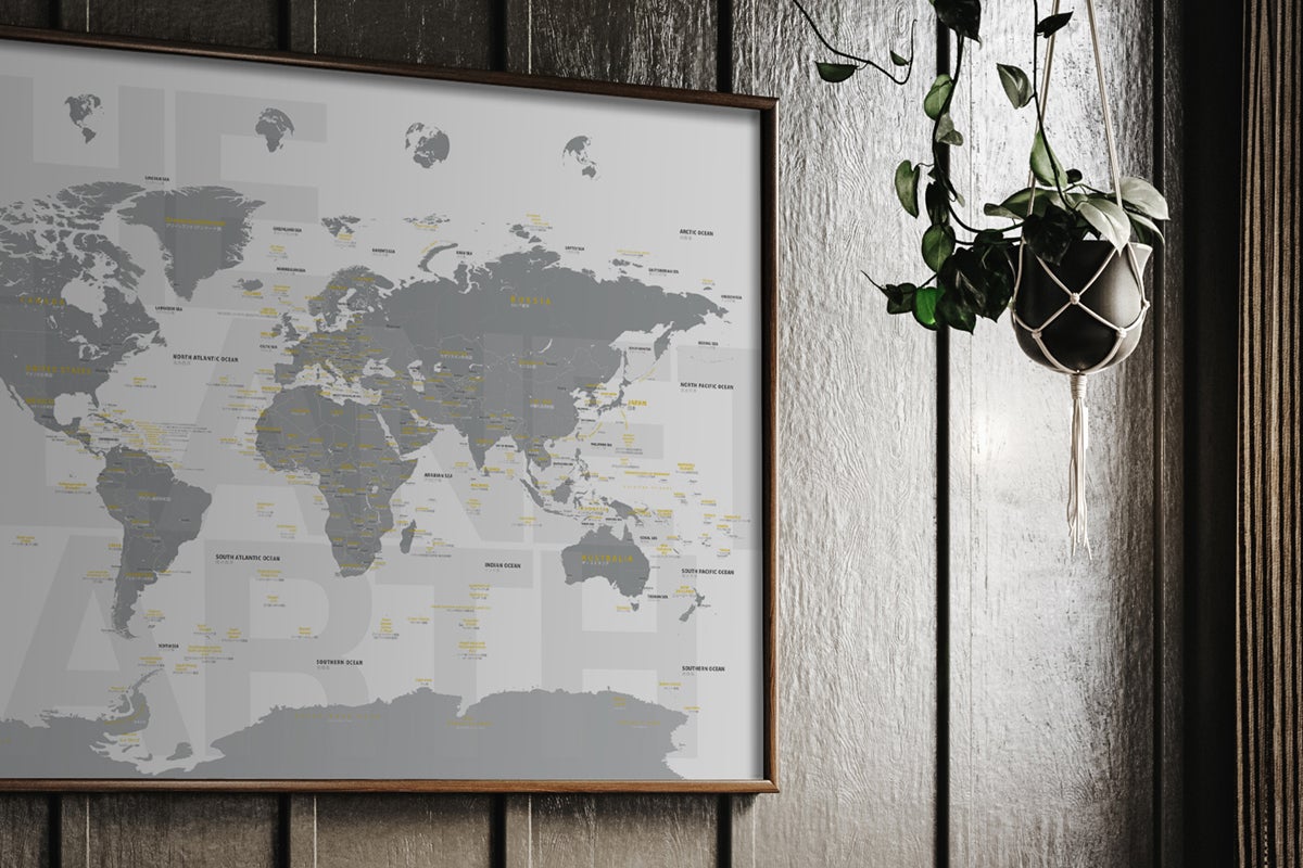 地図が本来持つミニマルな魅力や、機能美を最大限に活かしつつ、グラフィカルなアートポスターの要素も合わせた世界地図です。