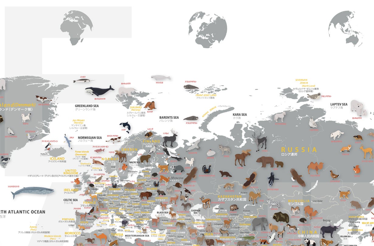 「インテリアのための世界地図」をもとに、地域に生息する動物を350種以上も描きこんだのが「どうぶつせかいちず」。