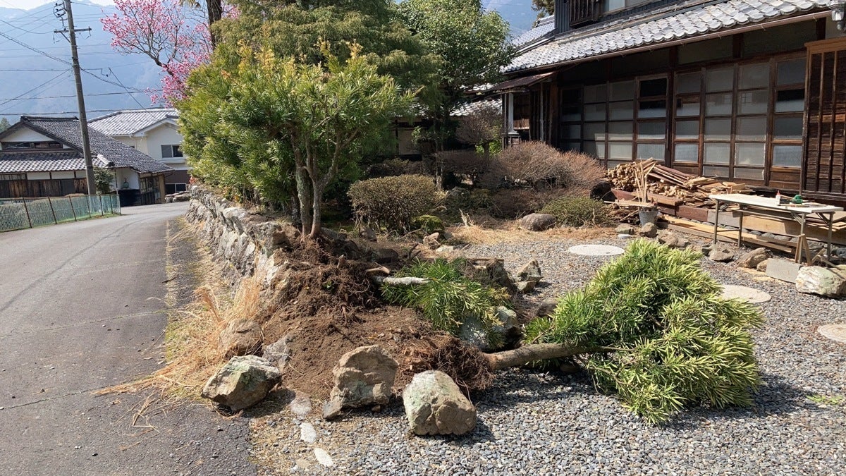 (家の前の石垣を崩し家の前に果樹を植える)
