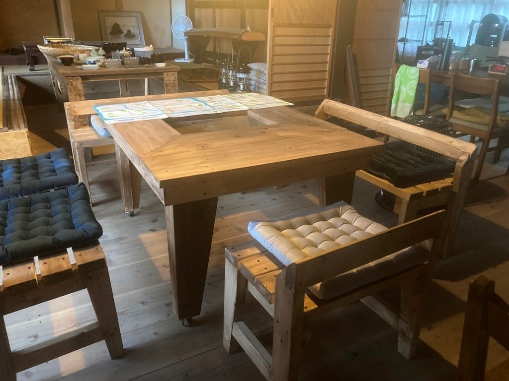 (テーブル、ベンチも手作りです)