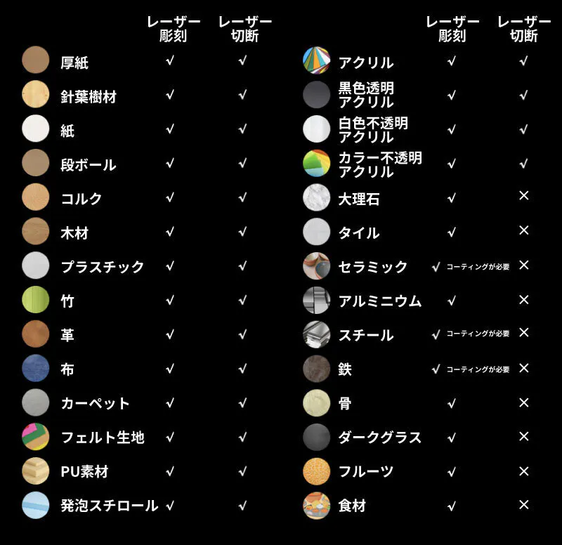 彫刻対象物の厚みの制限は特にありませんが、切断は10mm以下となり、また素材によっても変わります。