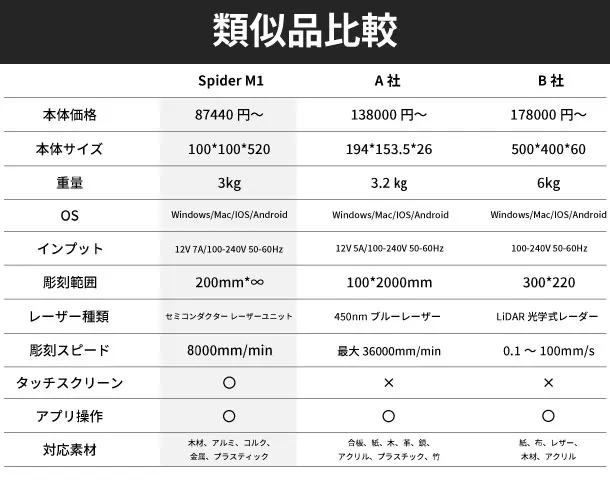 A:Spider M1 Standard/Spider M1 Pro は 200mm (幅) * 無制限の彫刻が可能、Spider M1 Max は 400mm (幅) * 無制限の彫刻が可能