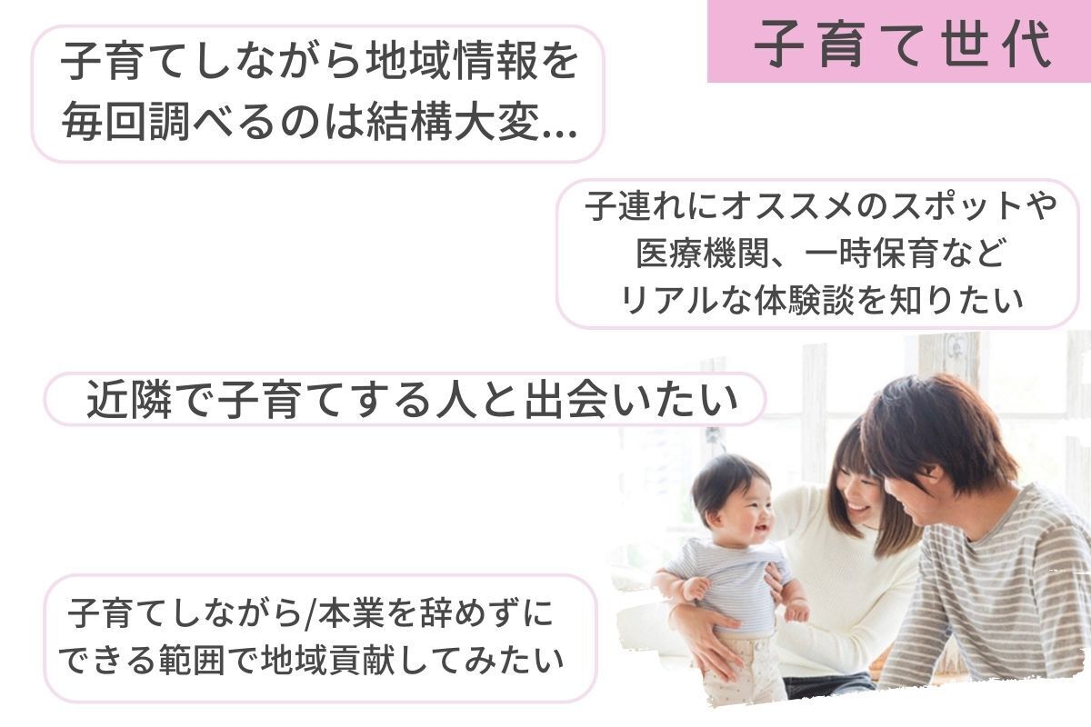 「地域で同じく子育てしている人と出会いたい」「自身の親子向けサービスを、もっと地域の方に届けたい」「自社のサービスを活かして、地域貢献をしていきたい」など、現在、子育て世代、子育て支援者、地域の企業・団体はそれぞれ課題や想いを抱えています。