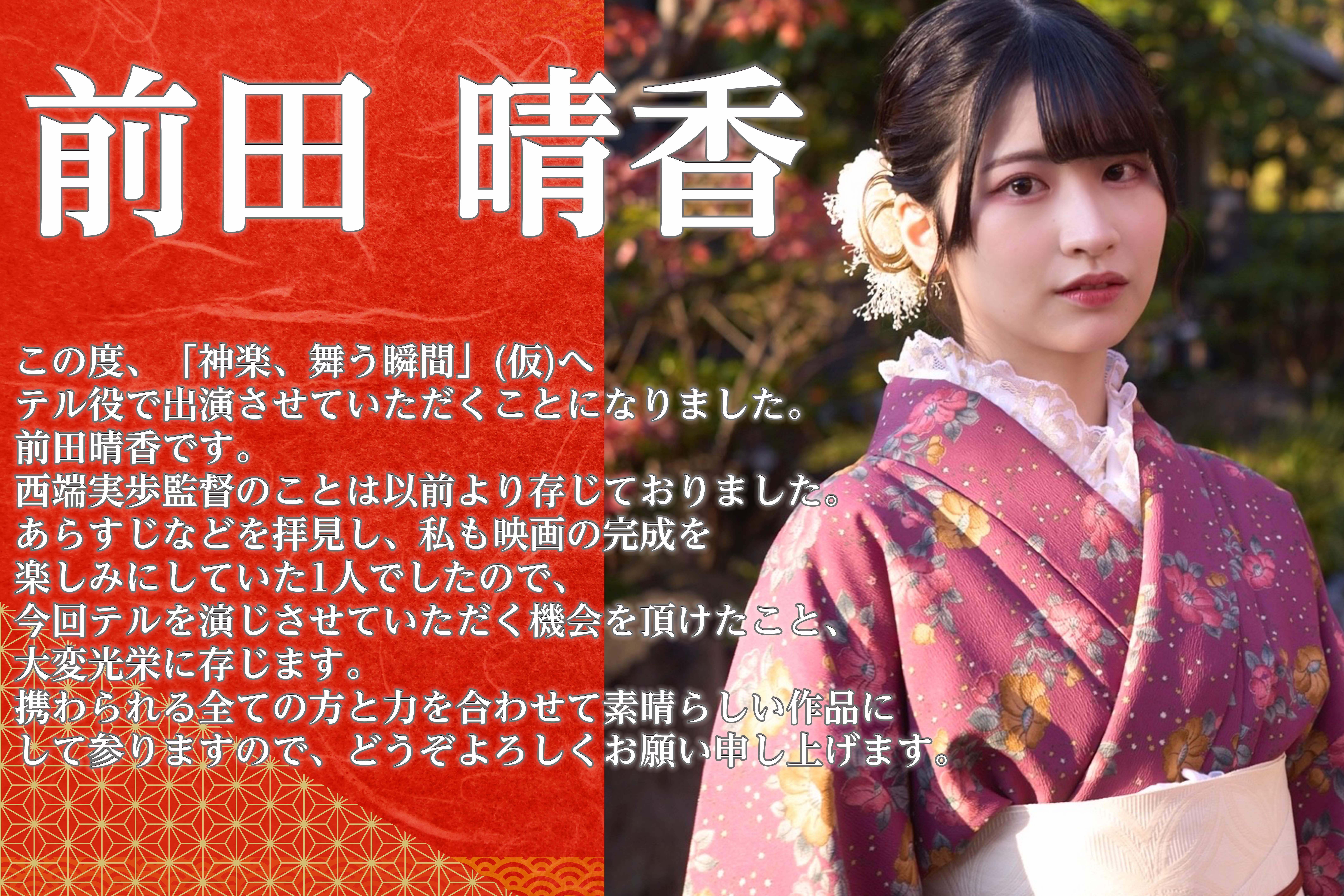 2023/04/18 22:30【☆出演者変更のお知らせ☆】事情により出演予定の「福山芽以」から「前田晴香」へ変更とさせて頂きます。ご理解のほど、よろしくお願い致します。<出演者コメント>この度、「神楽、舞う瞬間」(仮)へテル役で出演させていただくことになりました。前田晴香です。西端実歩監督のことは以前より存じておりました。あらすじなどを拝見し、私も映画の完成を楽しみにしていた1人でしたので、今回テルを演じさせていただく機会を頂けたこと、大変光栄に存じます。携わられる全ての方と力を合わせて素晴らしい作品にして参りますので、どうぞよろしくお願い申し上げます。 もっと見る