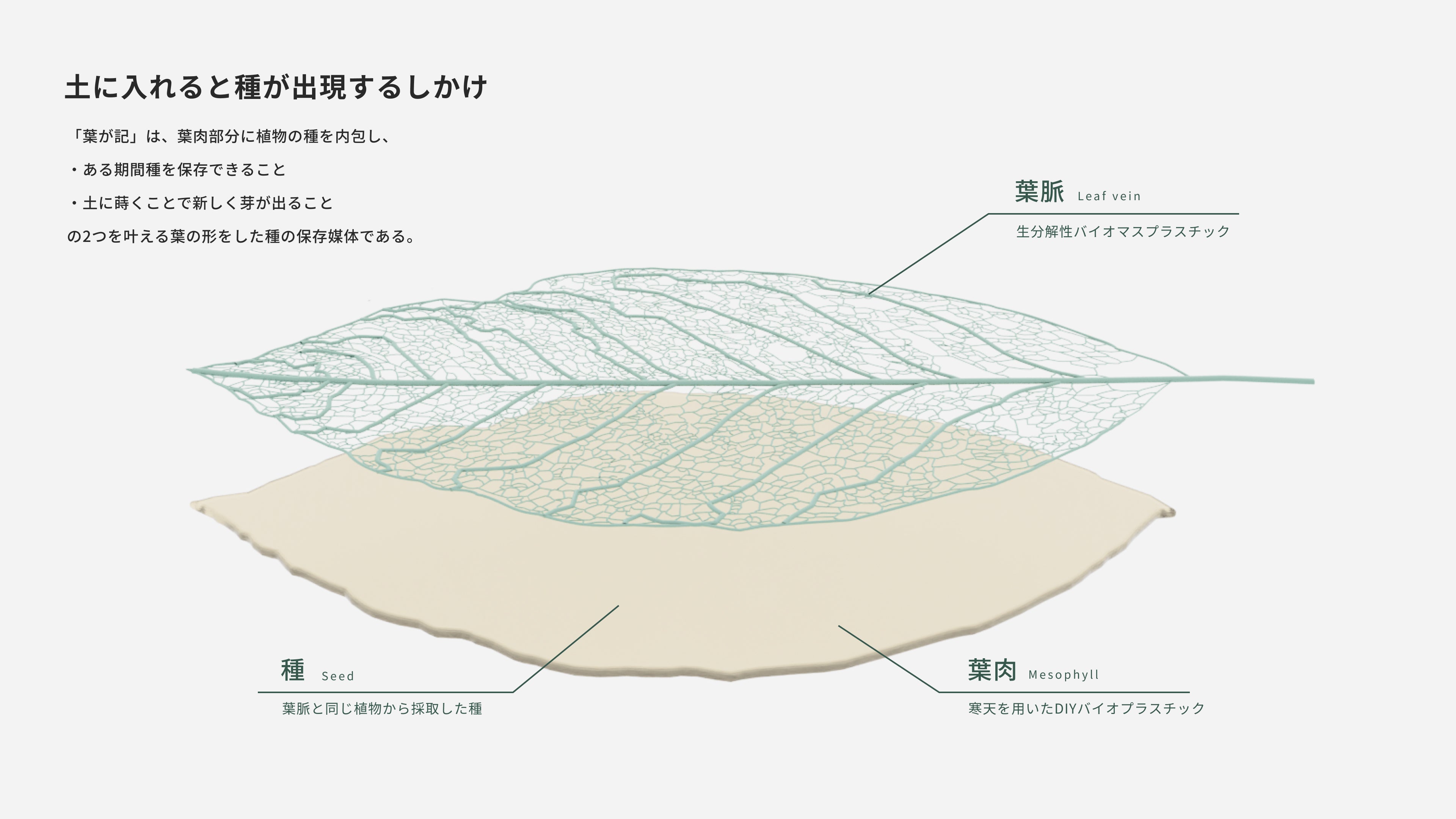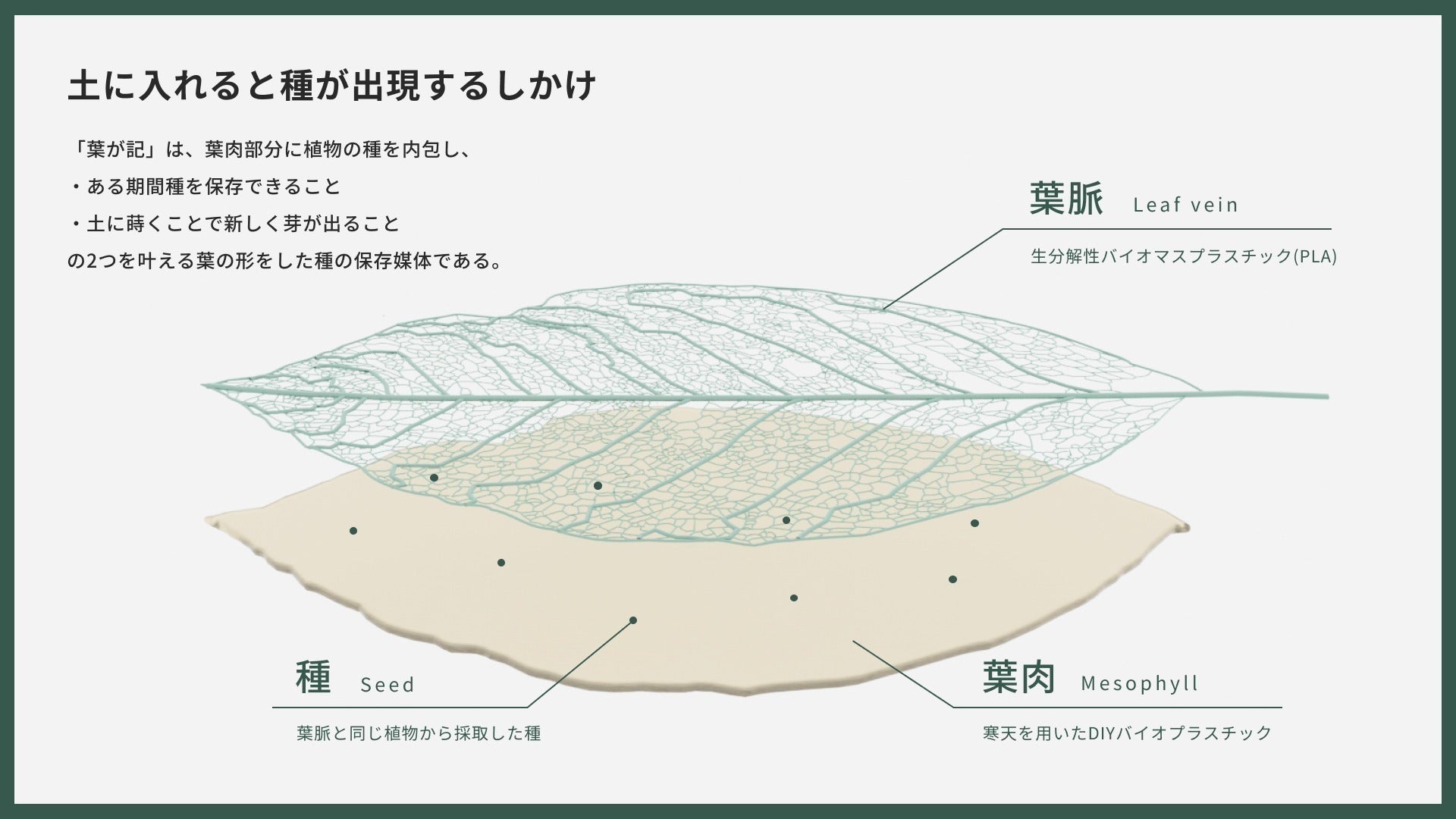 葉が記は、3DプリンタとDIYバイオプラスチックの技術によってつくられた、葉の形と種を保存する葉っぱのタイムカプセルです。その姿はまるで本物の葉っぱ。目で観て、触って、還して、育てて楽しむことができる人工葉となっています。