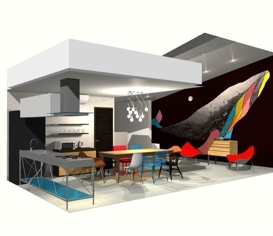 「HIGH」がコンセプトの、無機質でスタイリッシュなキッチンに鮮やかなアートの壁紙、そしてビビットでポップなインテリアからなる2階。