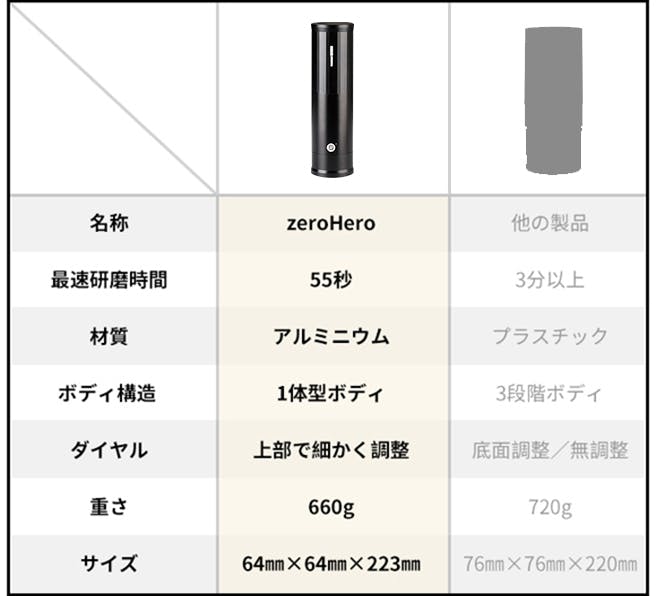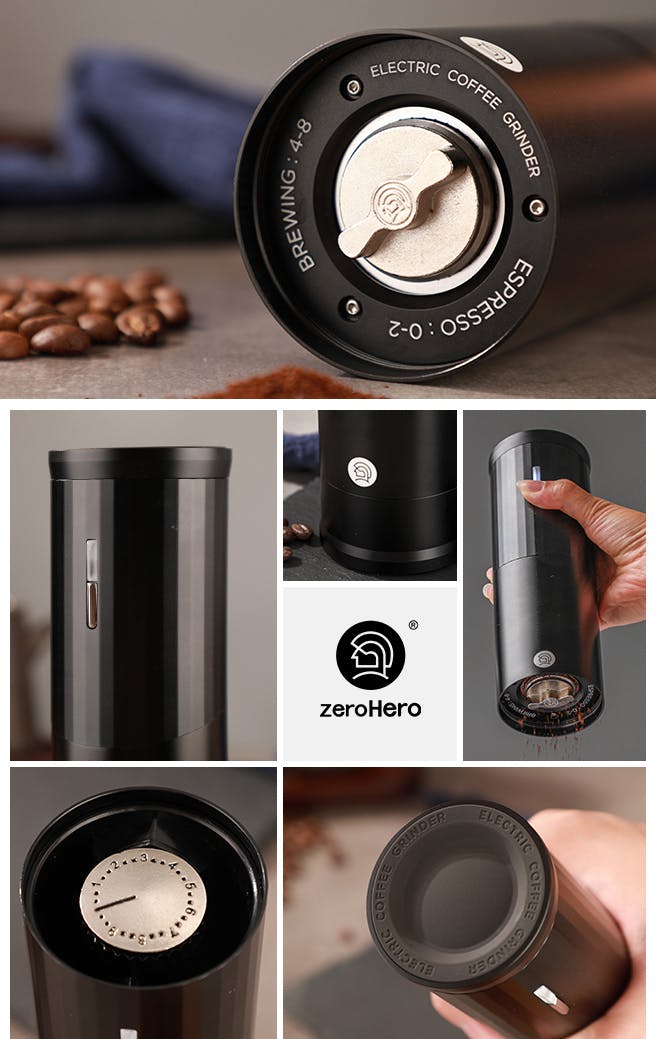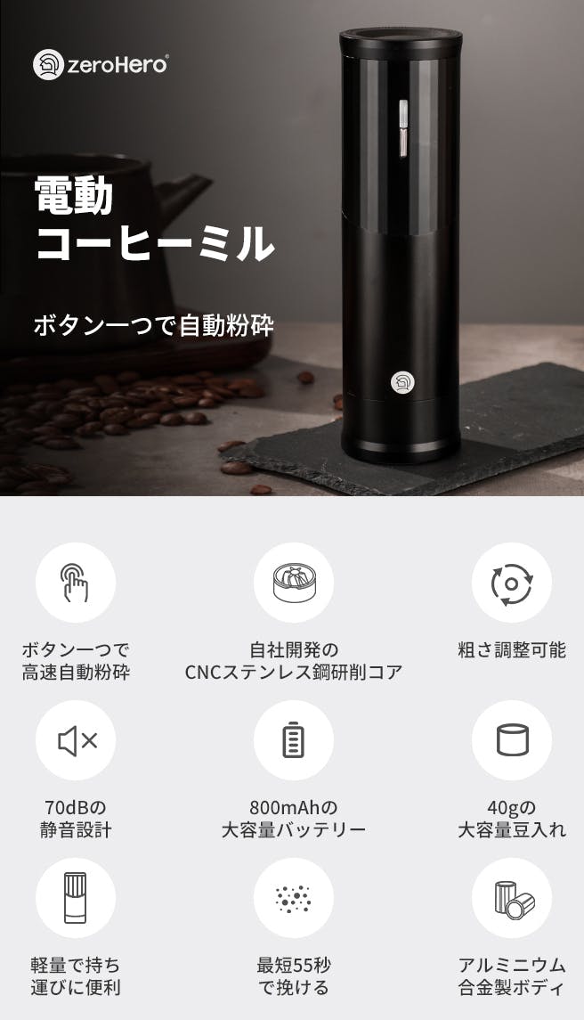 「zeroHero」電動コーヒーミルは、ポケットに入るサイズの「バリスタ」です。ボタン一つで自動的に細かくコーヒー豆を挽き、いつでもどこでも豊かで芳醇なコーヒーを楽しめる、超便利な本格的なコーヒー体験を提供します。
