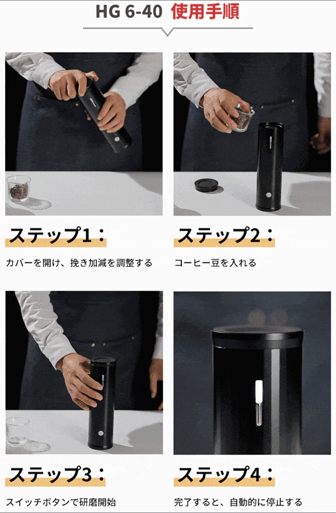 A4:非常に均一です。ヒーローは、強力なモーターかつ自社開発したHG6-40 CNCステンレス鋼研削コアで迅速かつ均一にコーヒー豆を挽くことができるようにしております。
