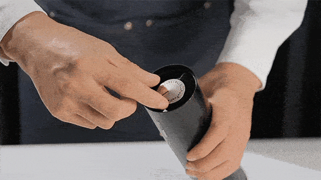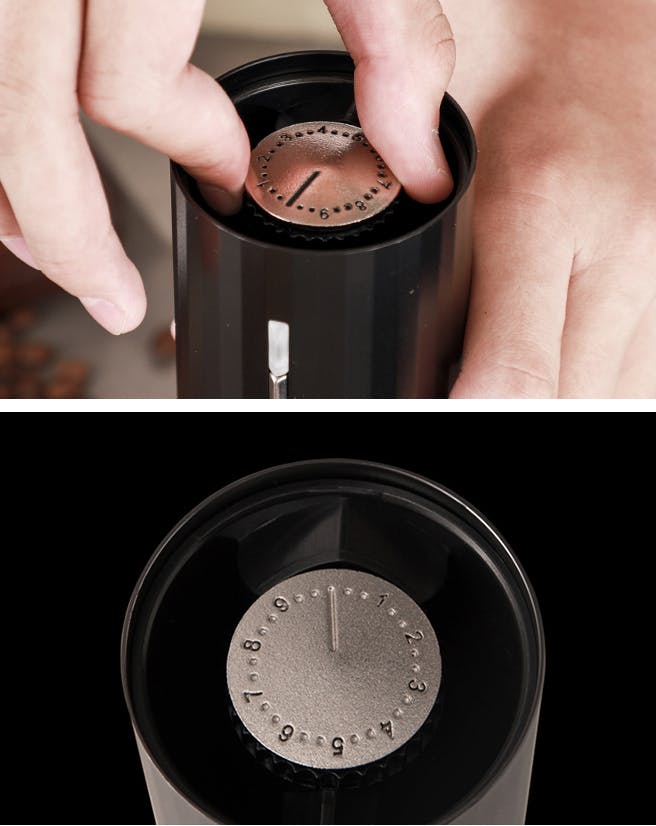 上部には挽き目調整ダイヤルがあり、手で直接グラインダーに触れることなく、直感的に粗さを調整することができます。よくあるものは、通常下部に調整ダイヤルがあるため、挽き具合を調整したいときは、その都度下を外して調整を行わなければいけなかったので、比べると「zeroHero」の設計は非常に清潔で便利です。