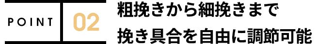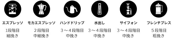 1~9段階の粗さで、お客様の好みや淹れ方に合わせて挽き具合を調整できます。エスプレッソ、モカエキスプレス、ハンドドリップ、水出し、サイフォン、フレンチプレスなど、あらゆる淹れ方に対応できるようにしています。