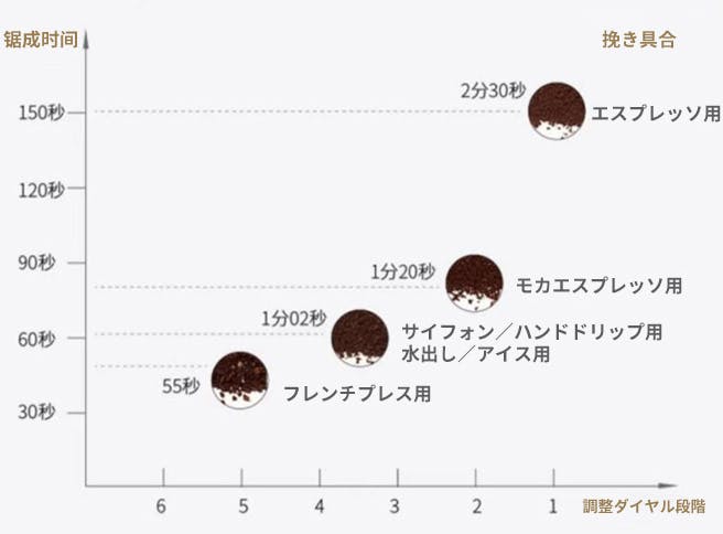 選択した具合によって、粉の挽き時間と粗さが異なります。 例えば15gのコーヒー豆を例にとると、味や淹れ方によって必要な挽き時間と挽き具合は下表のようになります。